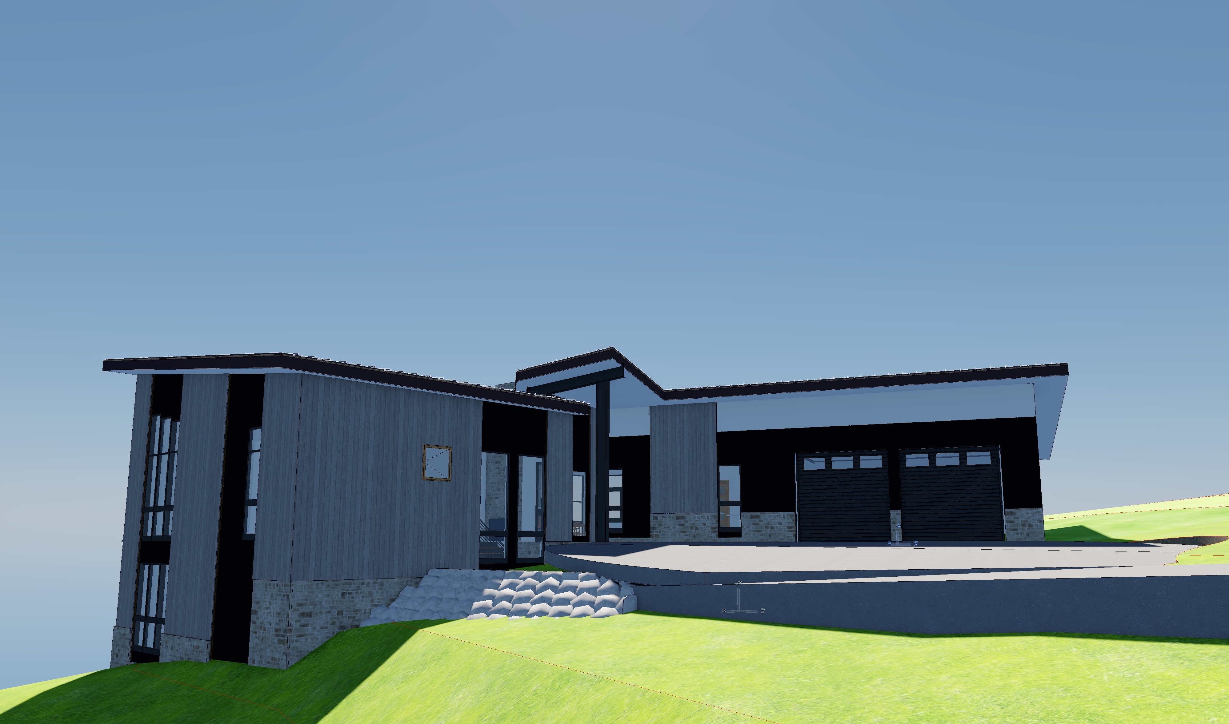 mountain modern ski home snowy pine forest in the background and distant mountains early sunset to the far left