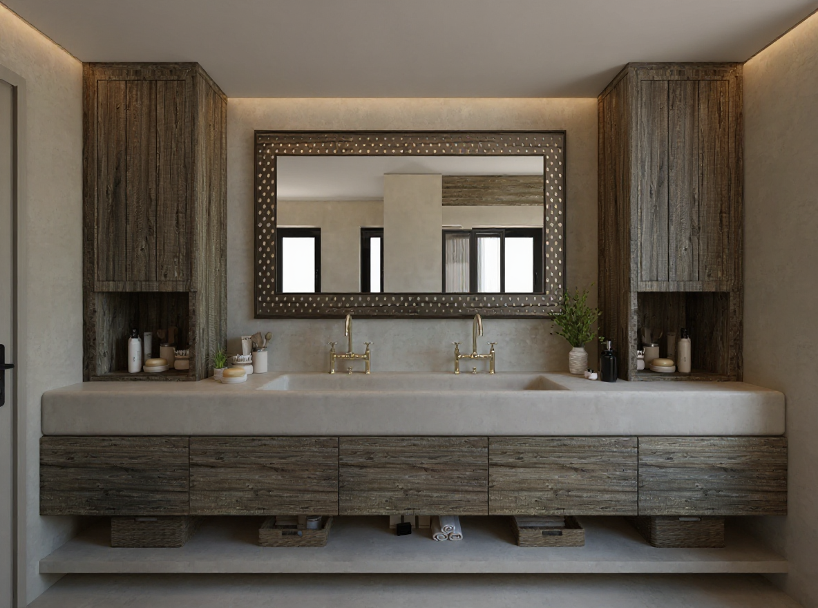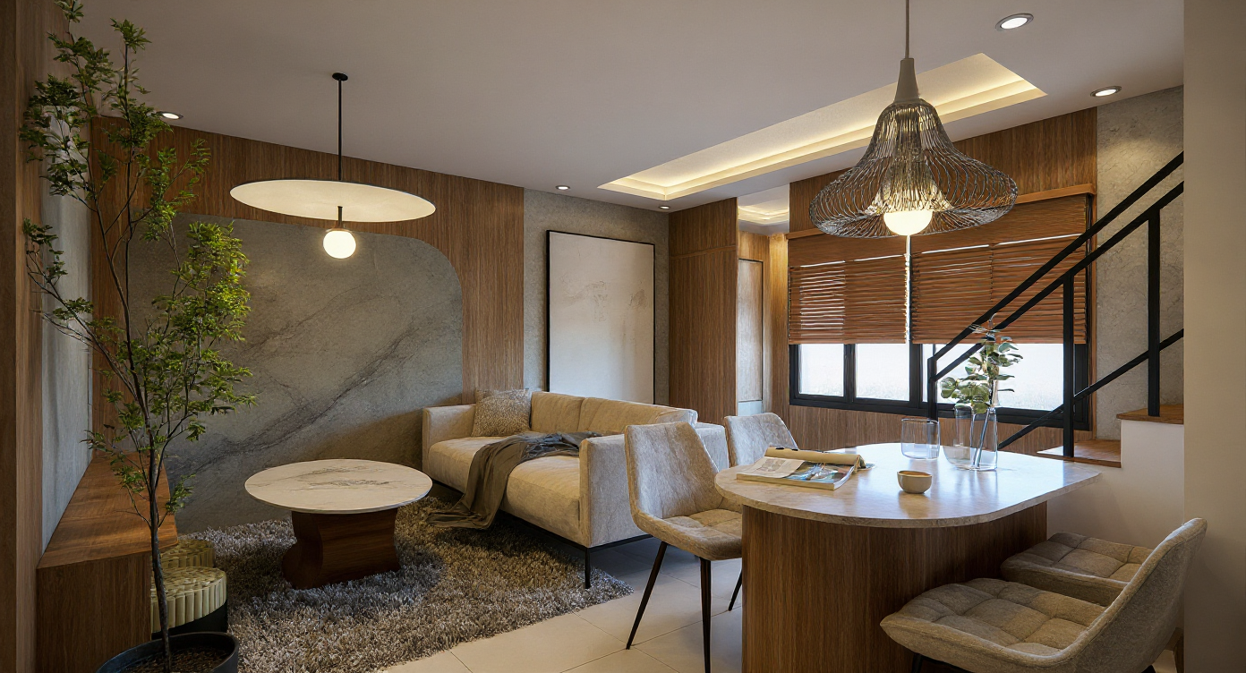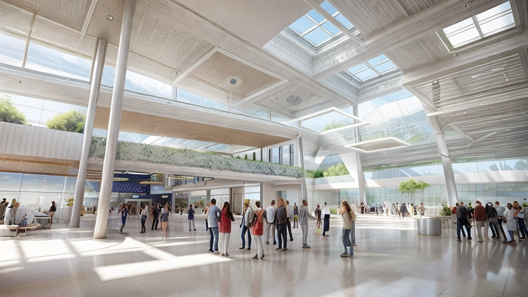 render a bustling modern airport departure hall with a harmonious atmosphere incorporate warm golden wooden ceilings contrasting with soft white walls and large skylights allowing a bright blue sky to illuminate the space add lush green plants and a stylish sign reading departure in elegant gold lettering feature groups of diverse travelers engaging at check in counters dressed in smart casual attire with varied colors the floor should be a combination of textured light grey and vibrant pastel green include sleek modern pendant lights hanging from the high ceiling emitting a soft white glow the overall ambiance is lively yet serene reflecting the excitement of travel