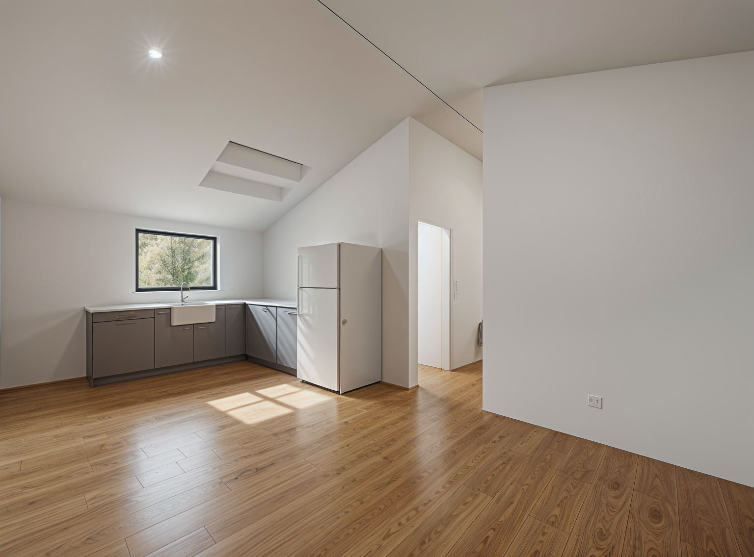 interior shot of kitchen and living room valuted ceilings with recessed light balanced with natural light from windows all wall are soft white with matte finish counter top is white as well with grey matte kitchen appliances flooring is wood like birch its mid day with light coming in from recessed lighten tv mounted on wall to the right expose ridge beam on ceiling include upper cabinets that has modern aesthetic
