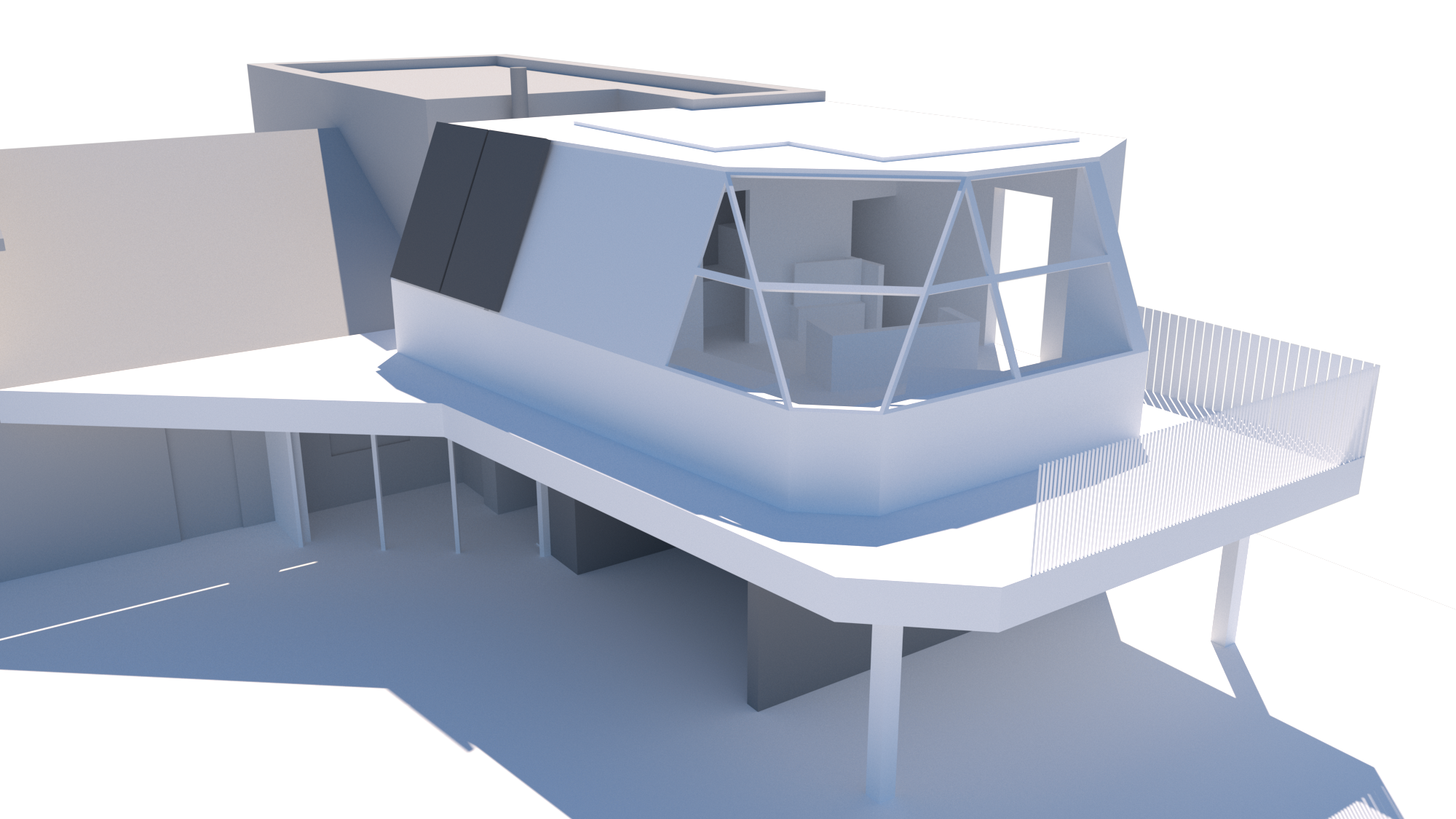 robert a m stern exterior shot die st tzen unten sind aus beton die horizontale plattform ist seitlich mit zink verkleidet der boden davon mit hellen fliesen under der rest des volumens ist in zink zu verkleiden link und hinter vom objekt ist ein bestandgeb ude dies kann in weis dargestellt bleiben architecture
