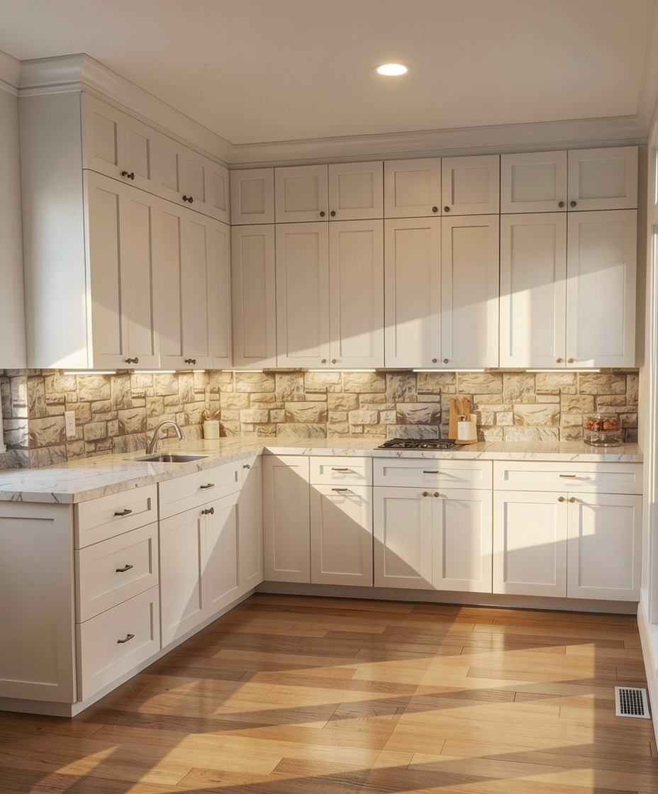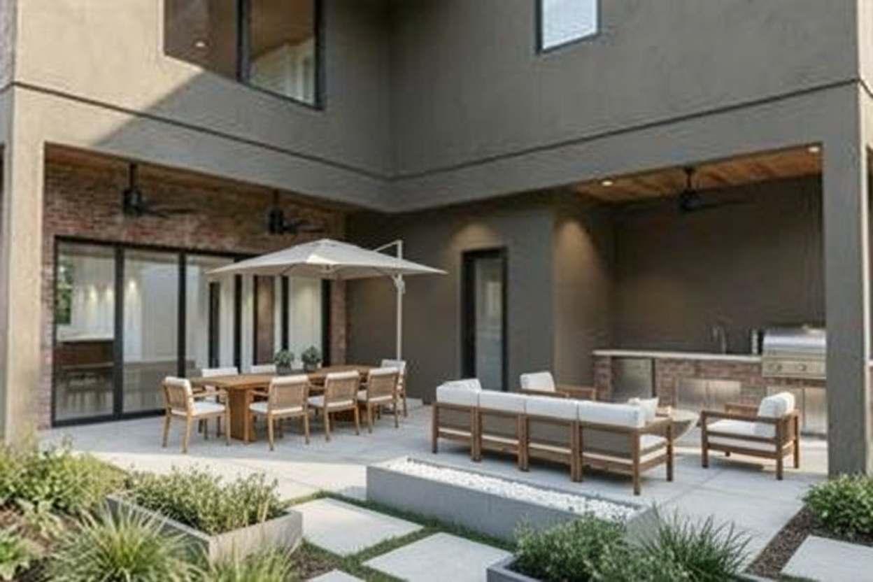ultra realistic modern living room warm minimalist interior curved modular beige sofa round marble and walnut coffee table linear fireplace built into dark walnut chevron wall panels floating marble bench oak hardwood floor sculptural led ribbon chandelier floor to ceiling window with blinds soft daylight neutral beige and brown palette luxury contemporary interior architectural visualization vray render octane render global illumination soft shadows interior photography wide angle lens 8k highly detailed