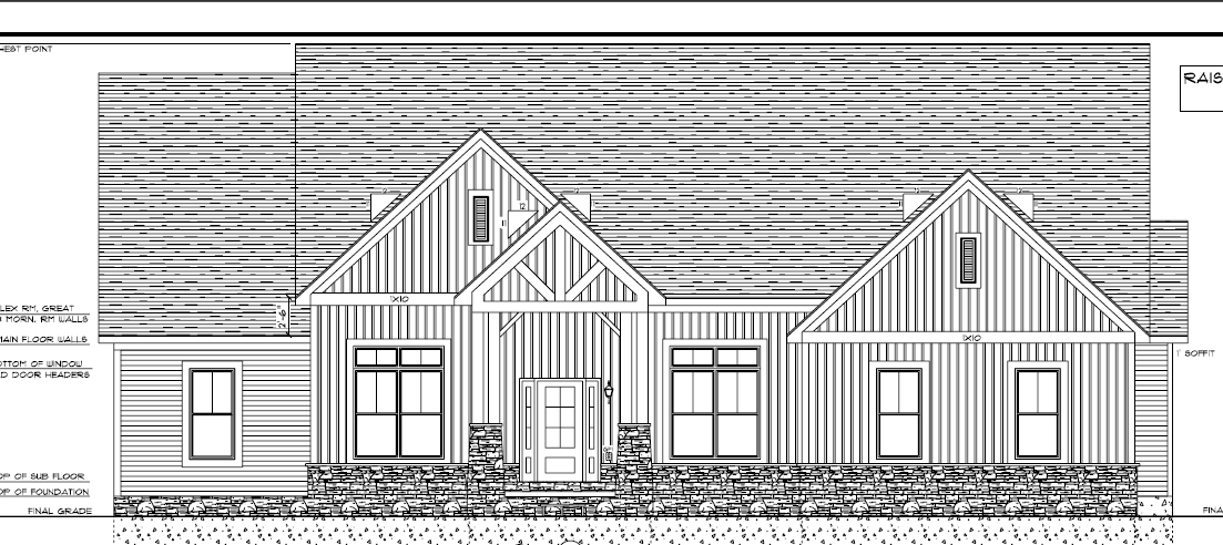 make as photorealistic as possible while keeping textures the same as selection professional landscaping in a lightly wooded scene with good lighting dark grey vertical black gutters black trim medium grey stone black windows black roof shingles black front door light cedar porch post and truss porch trim