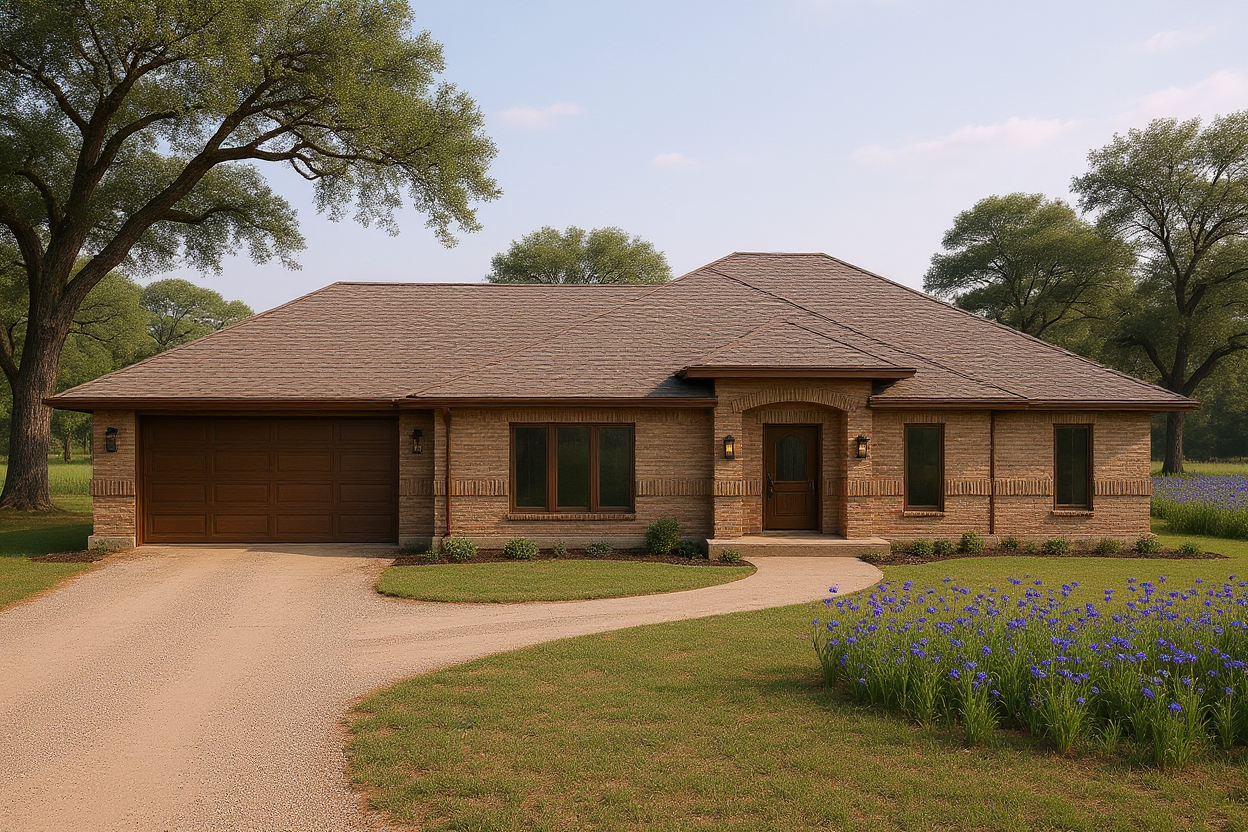 texas farm land setting with medium height foundation planting mottled brown roman brick bronze paint on doors windows fascia cream colored window frames oak trees in yard taper walk up to front porch gravel drive to garage door infill yard with fields of blue wildflowers in yard ramp sidewalk up to front porch ledge at base of house is concrete wall lights both sides of garage door sunset with interior lighting all windows casement