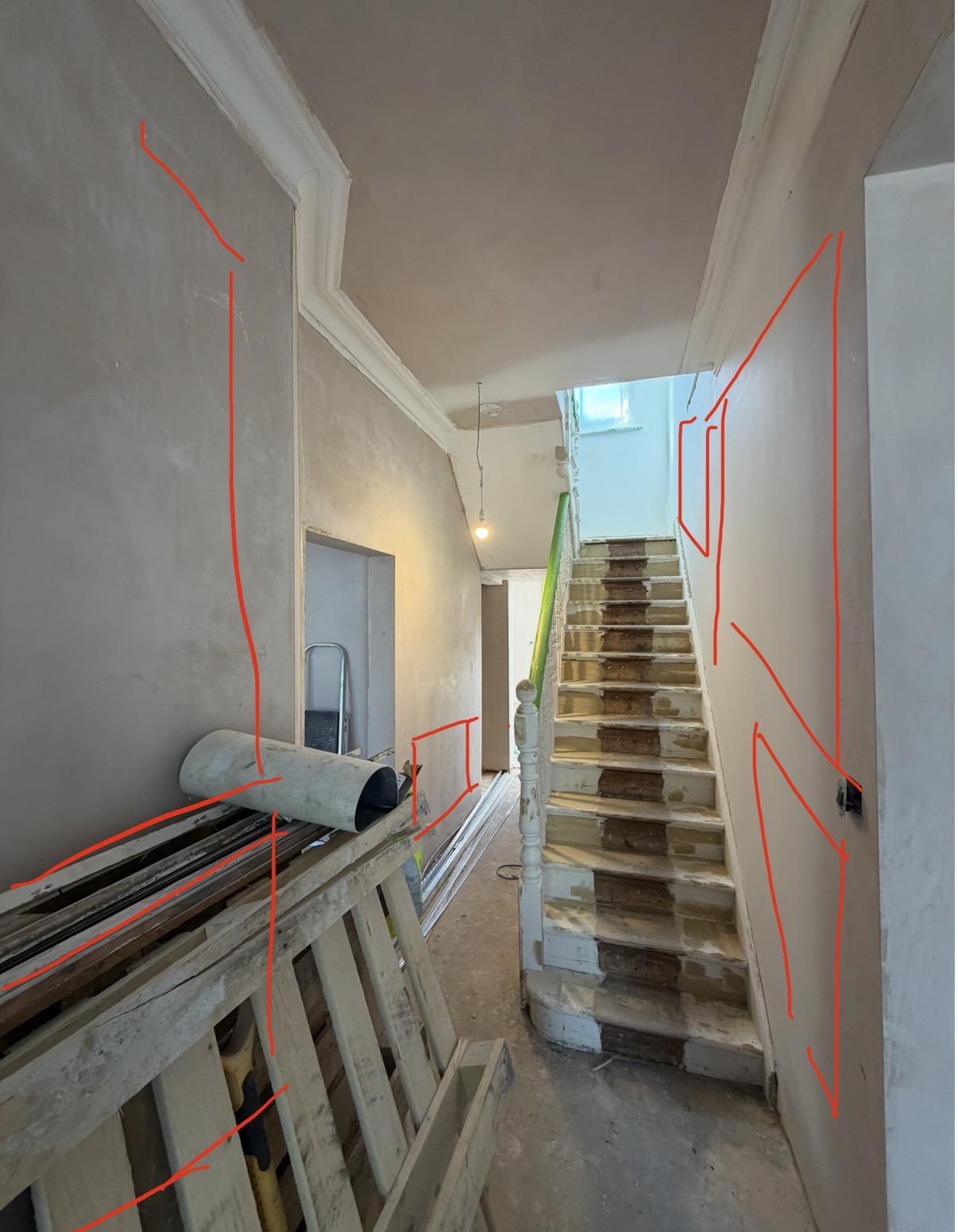 light beige walls with mouldings following the red lines straight white ceiling white staircase with a narrow beige runner on top