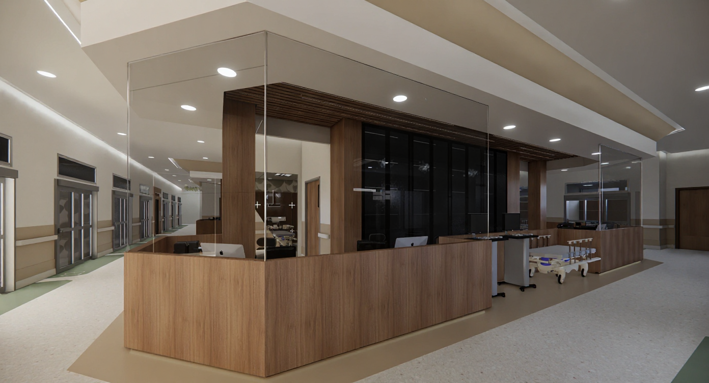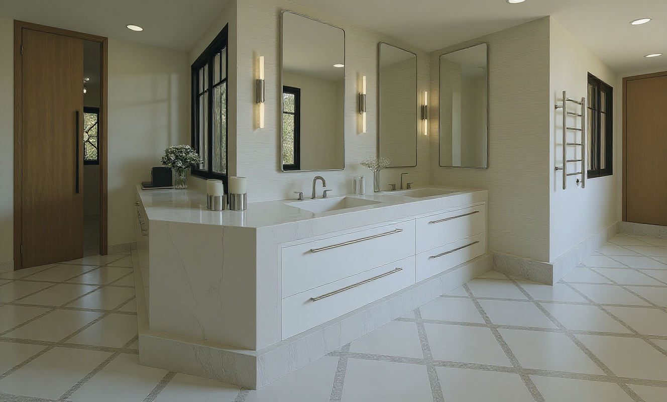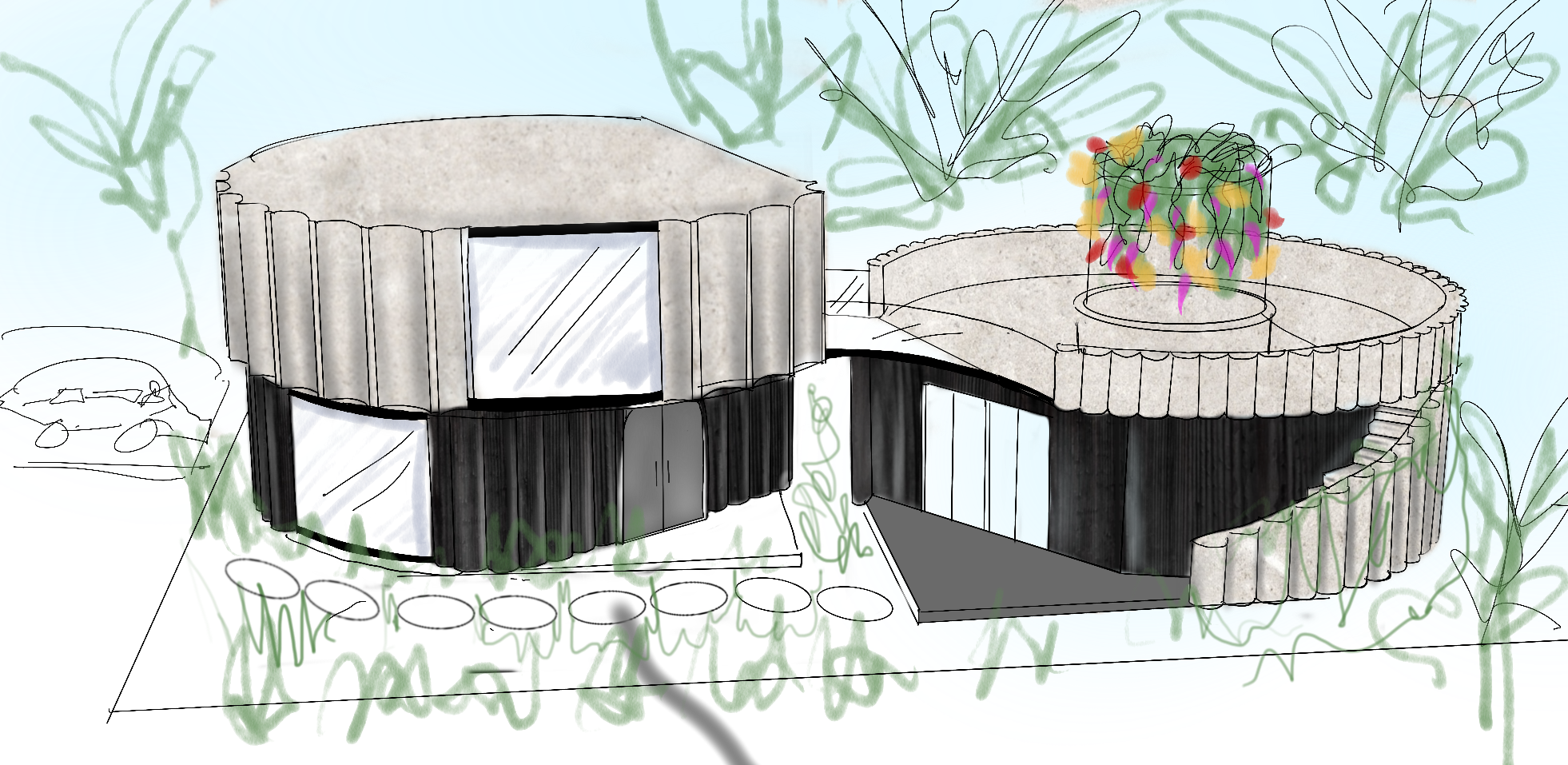 using the first image as the exact geometric and camera reference render it into a fully realistic residential home that matches the material language lighting and realism of the second image maintain the same camera angle perspective proportions and massing as the first image do not rotate reframe or change viewpoint apply the same materials and finishes seen in the realistic reference ribbed concrete or stone cladding dark metal vertical fins at the lower level smooth curved upper volume realistic glass with reflections and subtle weathering set the project in los angeles with sunny clear skies warm afternoon light soft shadows and birds flying overhead add landscaping consistent with southern california low shrubs grasses palms include a modern car parked in the left parking lot only aligned with the site plan the building should read as a high end contemporary home photorealistic architectural visualization quality ultra detailed textures realistic scale natural lighting depth and atmosphere no abstraction no sketch lines no diagram colors photorealistic render only add lounge furniture on the roof top anf glass railing on the bridge that connects both buildings