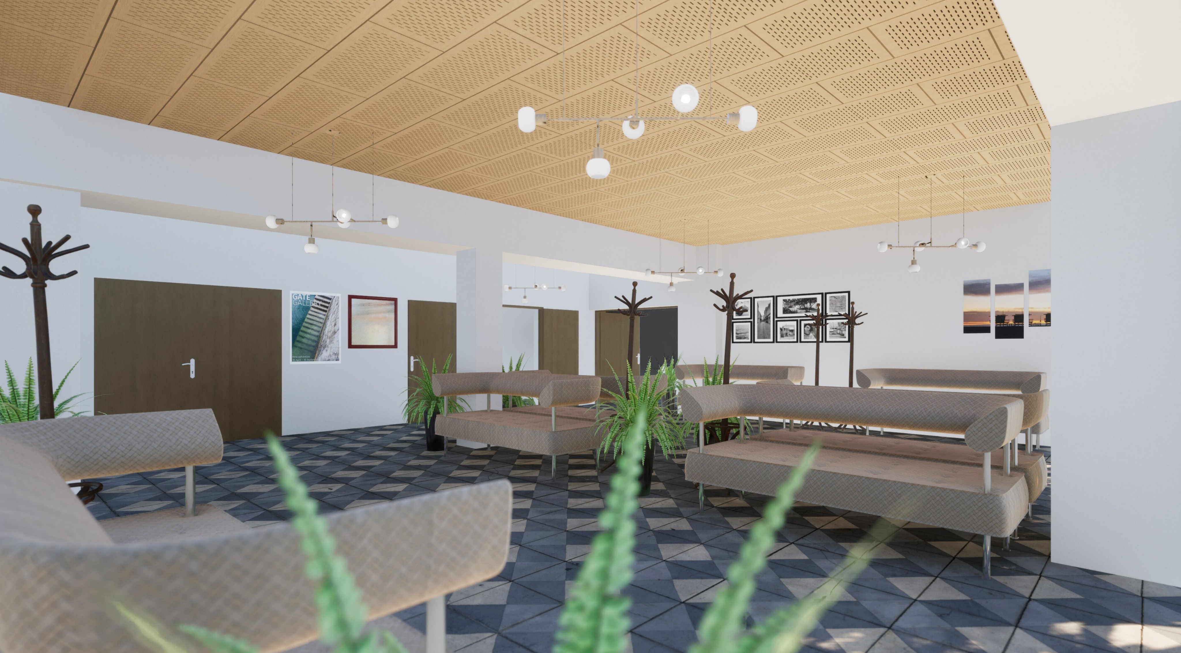 a spacious modern lobby with a cozy ambiance featuring a light wooden ceiling with intricate patterns complemented by white walls the floor is a geometric tile pattern in shades of gray and beige the area is furnished with curved cushioned benches in a warm beige color lush green plants are strategically placed for a touch of nature modern light fixtures with white orb bulbs hang from the ceiling casting a soft warm glow dark wooden doors and stylish coat racks add depth art on the walls ranges from abstract to serene sunset prints enhancing the serene welcoming atmosphere
