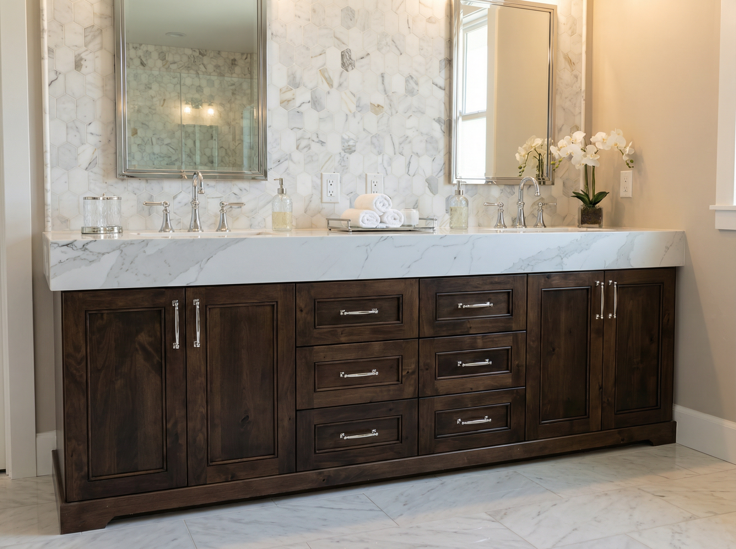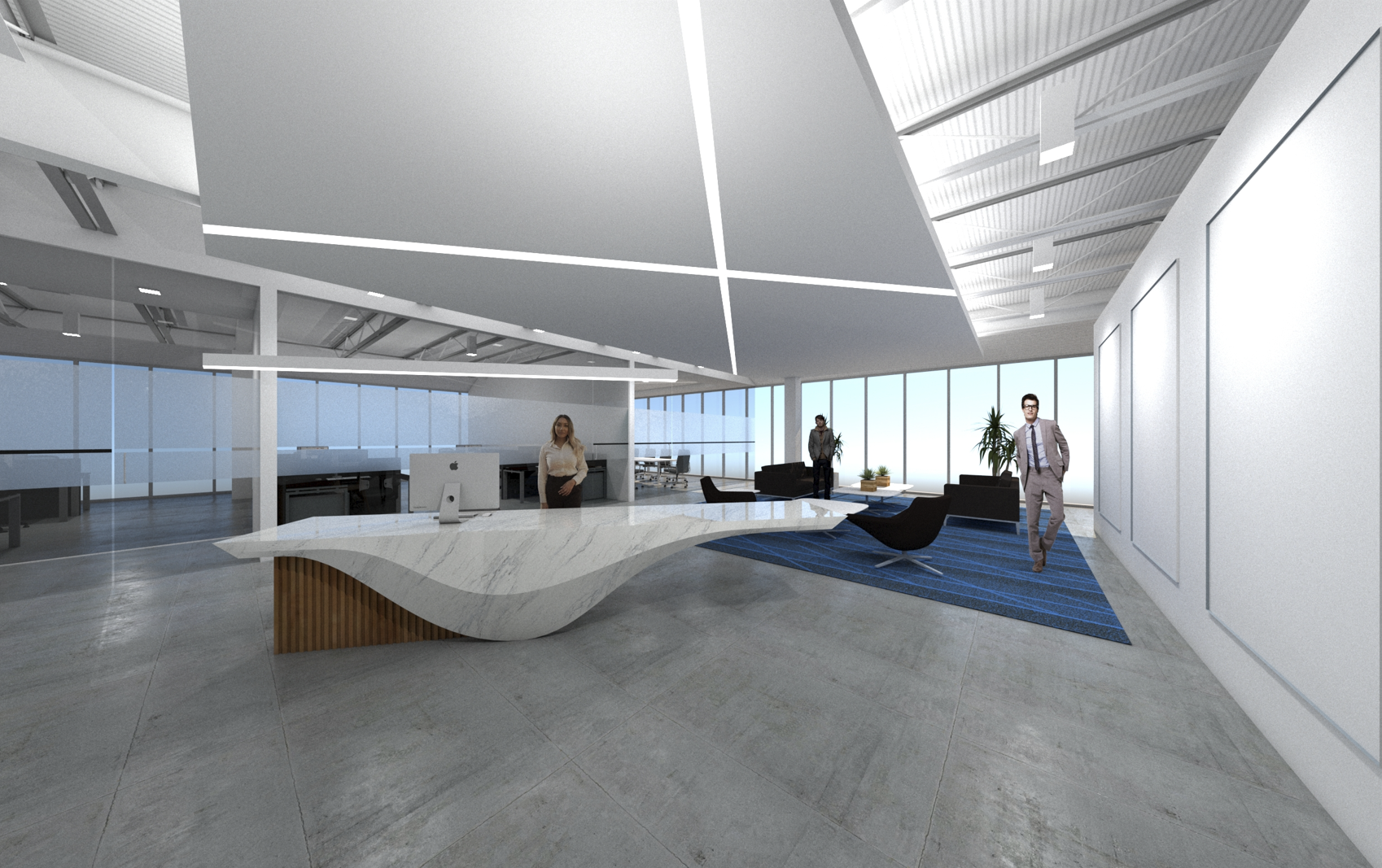 bright modern office lobby with accent lighting and contemporary art in the panels on the walls