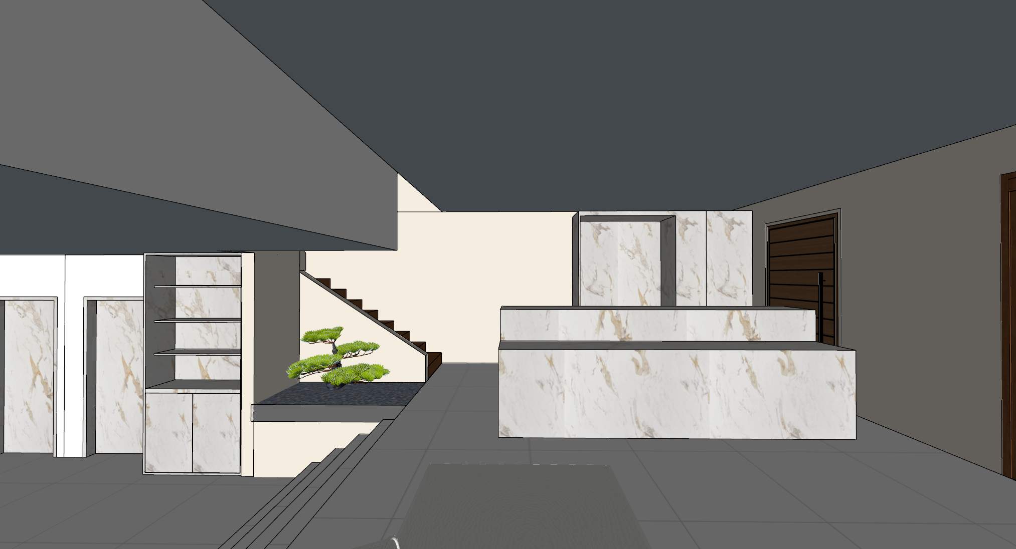solid white floor tiles marble lamainte cabinets off white painted walls snow white fabric sofa add warm lighting on ceiling cove lights