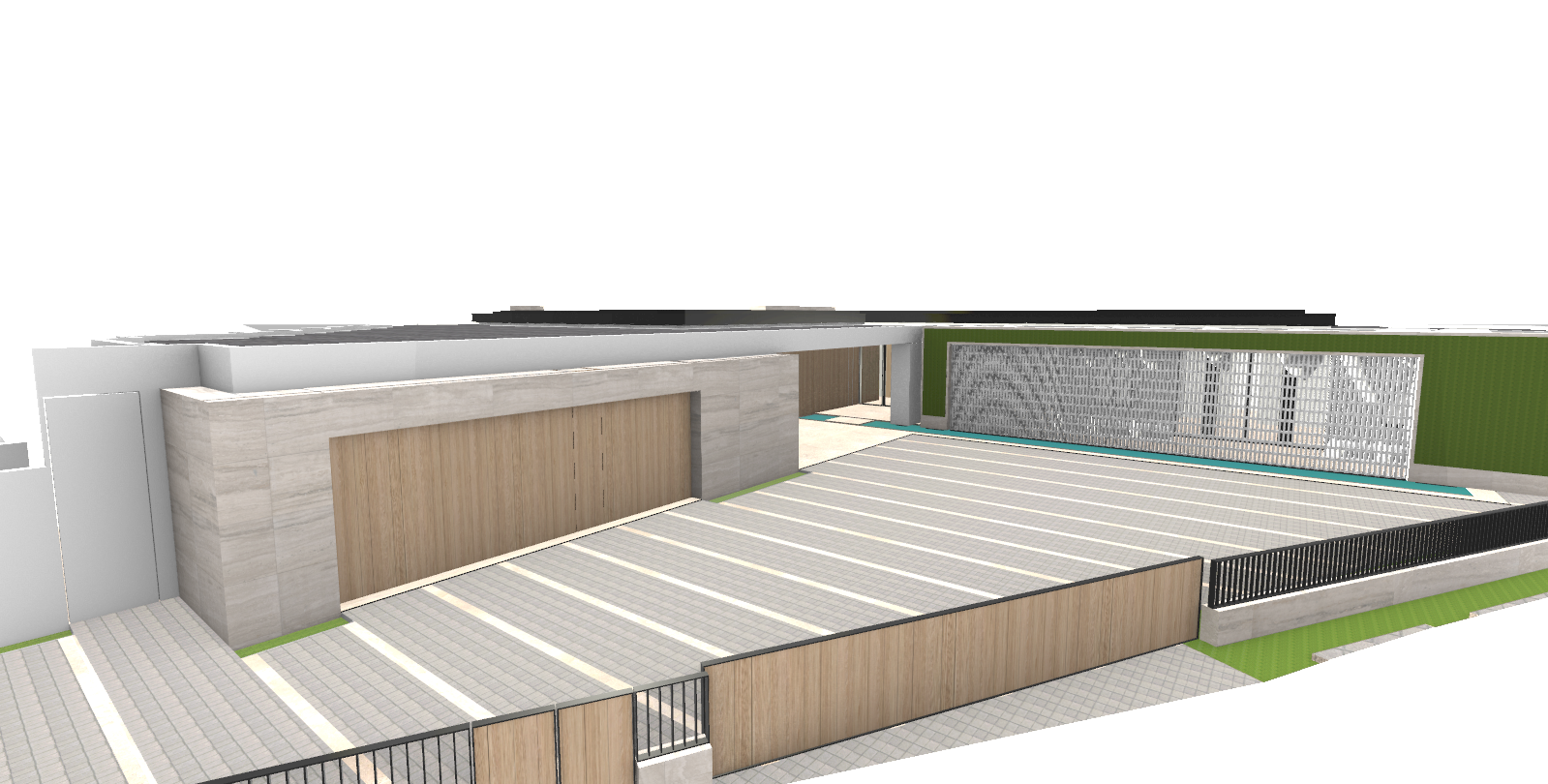 create a photorealistic rendering this is the entry driveway it has a long wood panel sliding entry door from the street 42 high the driveway is made of gray cobblestones with limestone stripes the garage has travertine stone tile finish and wood panel doors with planters on each side of the wood panel doors on the right side there is a long and tall travertine stone wall with an opening that is filled with rectangular breeze blocks this wall is covered with plants green wall this wall sits on a shallow water feature