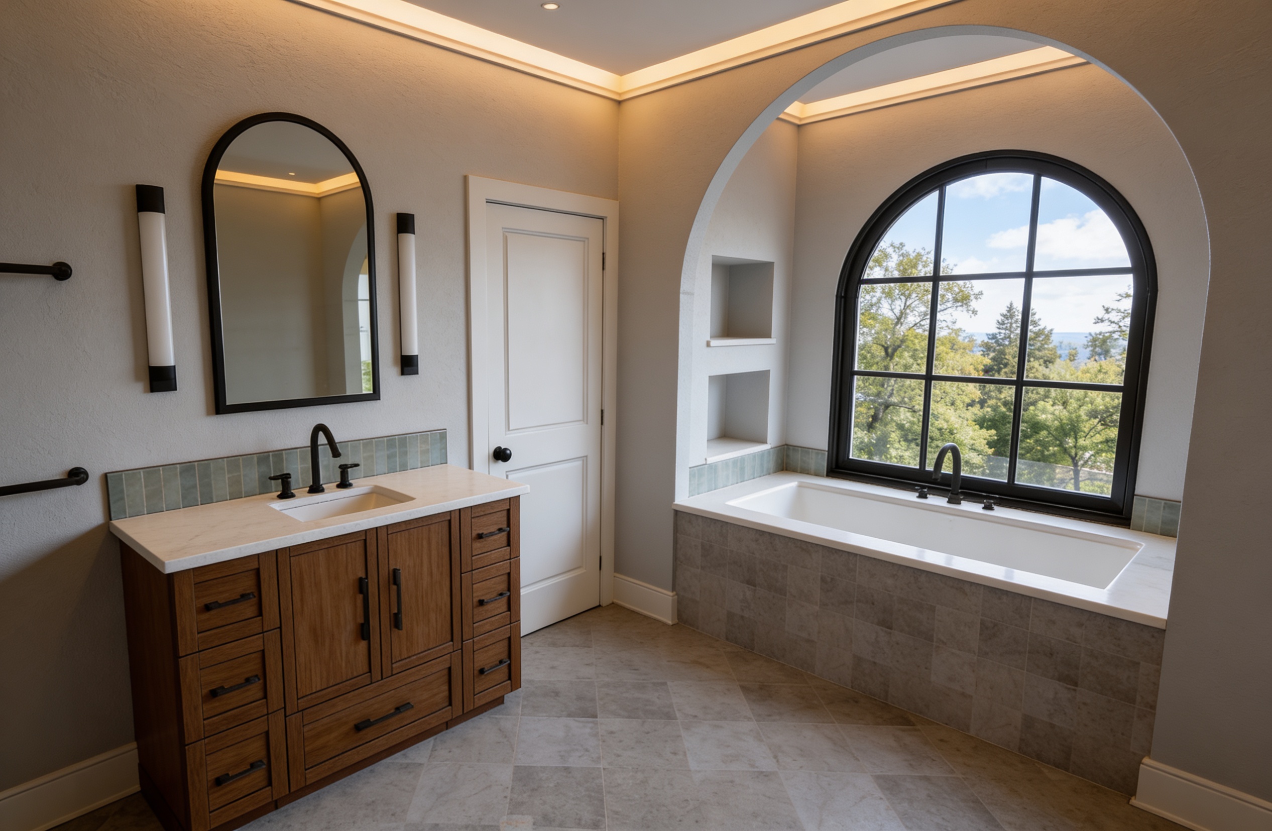 make photorealistic make vanity wood more rustic wall and niches are drywall add trees and sky out window brighten