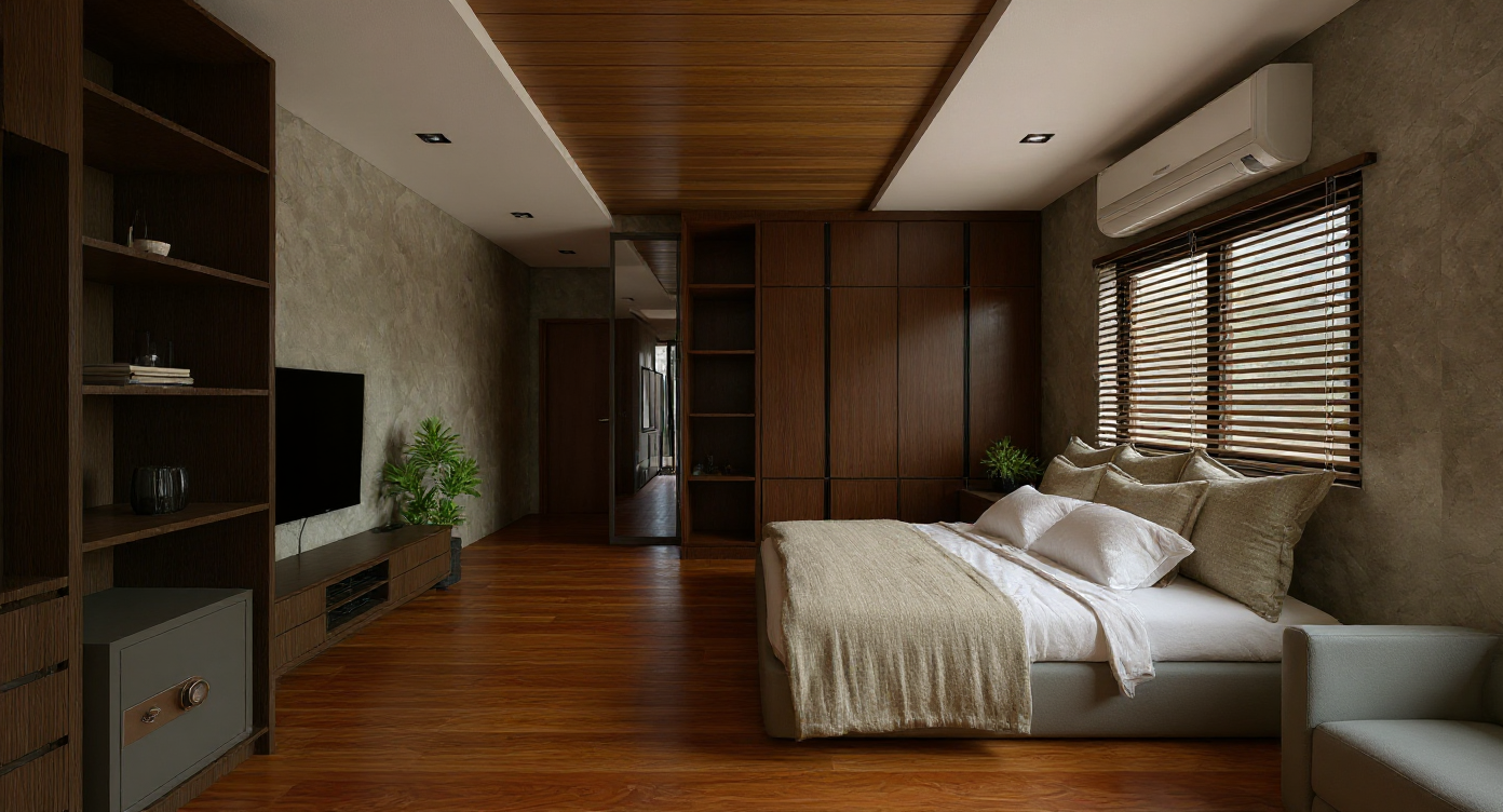 create a photorealistic dusk rendering of the provided sketchup model maintain all elements and forms exactly as shown keep the 4 round pipe columns at the covered drive do not replace them with timber or decorative posts use a classic shingled roof light colored stucco exterior and dark burgundy window frames make the window glass reflective of the environment set the scene at dusk under a clear sky with enough ambient light to see soft artificial lighting on the building and a warm glow from interior lights clad the tall vertical element that splits the gable roof behind the covered drive in natural stone masonry similar to the existing stone seen on site to create a grounded and welcoming presence place a backlit sign reading pocono daycare along the edge of the covered drive roof above the entrance doors keep the fascia of the covered drive clean and simple no wood trim create a calm inviting composition with soft shadows and subtle reflections on the pavement to suggest a freshly sealed surface architecture