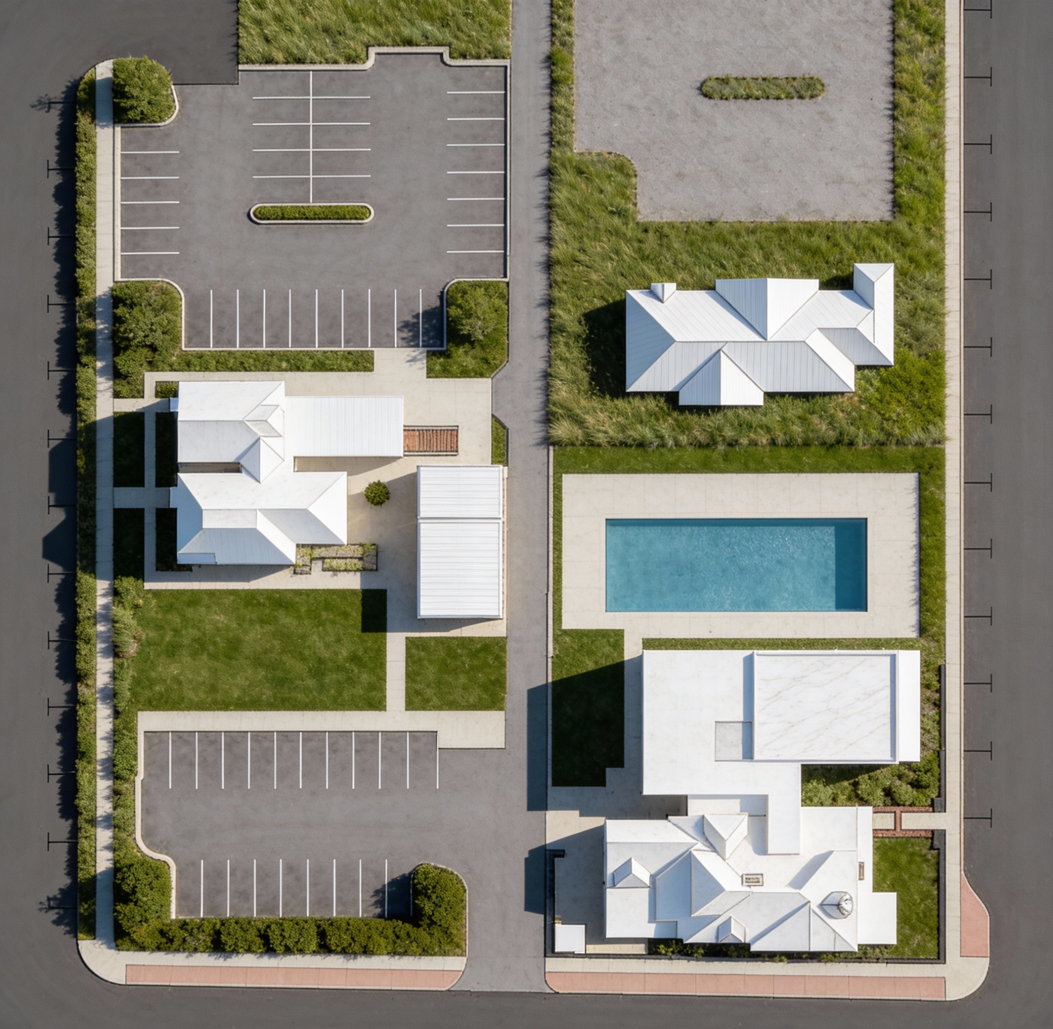 architectural site plan sketch in plan view preserve exact building footprints roof outlines circulation paths parking layouts stairs ramps pool geometry and all labeling apply soft hand drawn linework with slight sketch irregularity and light pencil ink texture use simplified diagrammatic trees with rounded canopies and minimal shrub forms sidewalks and paths are lightly shaded and cleanly defined color palette is soft and green oriented with muted earth tones warm off white buildings and light gray paving overall style is calm minimal and presentation ready an architectural sketch aesthetic not photorealistic or 3d