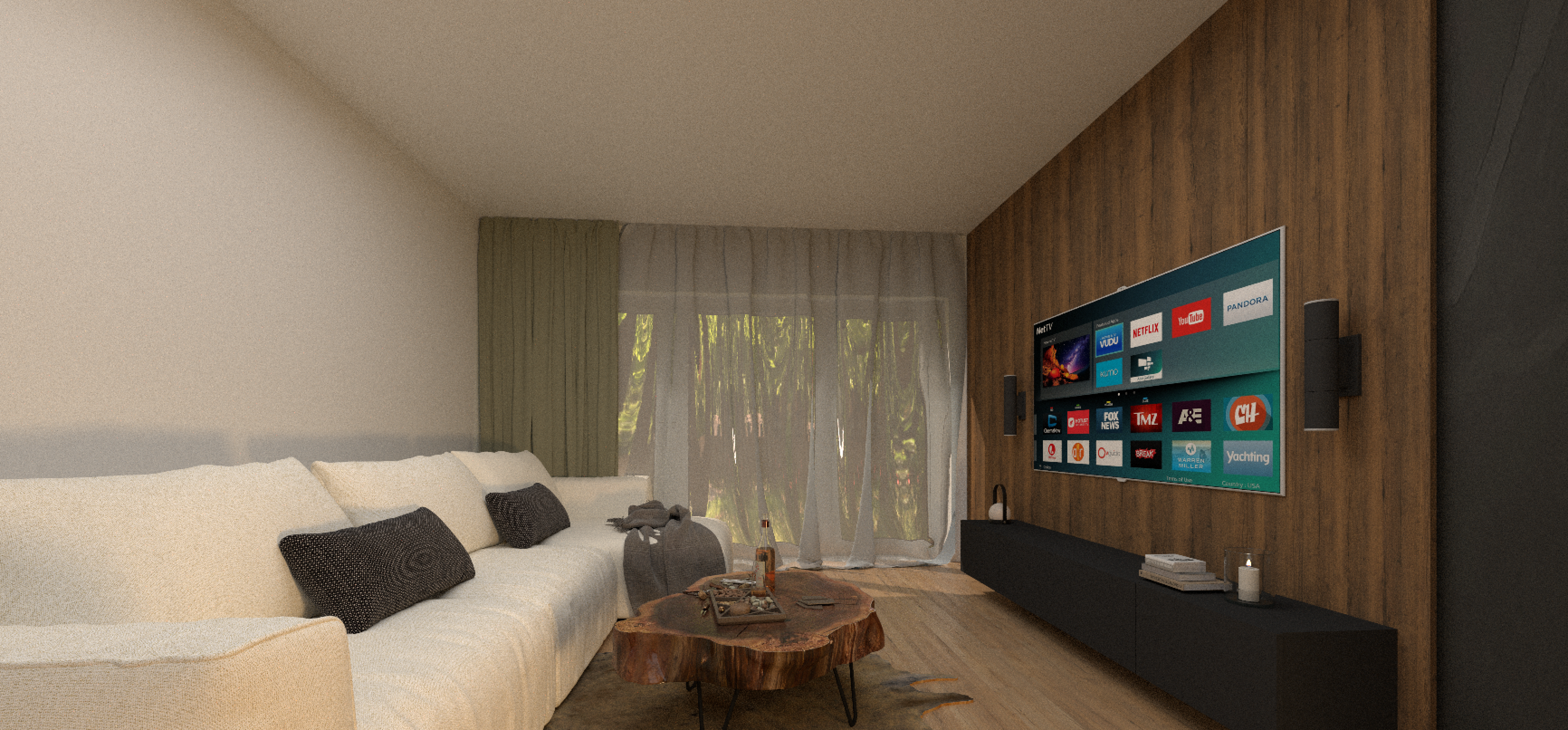improve the realism of interior render while keeping the exact layout camera angle and furniture placement unchanged enhance natural daylight add soft warm led lighting 300k to shelves and cabinets improve material textures and reflections increase contrast depth and shadows for a premium architectural visualization the chairs are from dark wood and kitchen backsplash is egger f228 titanit antracit matt the curtain is olive green