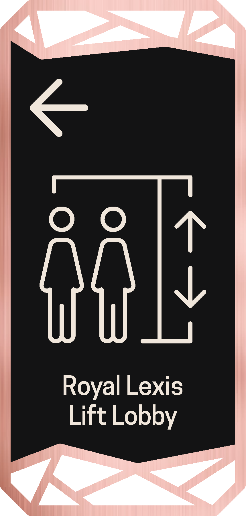 interior shot elegant internal wall mounted wayfinding signage inside a 5 star luxury hotel corridor featuring messaging icon and arrow in ivory white acrylic with a smooth matte finish messaging panel crafted from black mirror material for a sleek reflective surface framed with rose gold stainless steel in a fine hairline texture precisely mounted on a textured marble or stone wall illuminated softly by surrounding warm ambient lighting around 2700k that enhances the reflective contrast of the materials subtle highlights on the rose gold frame ultra photorealistic rendering cinematic warm interior mood
