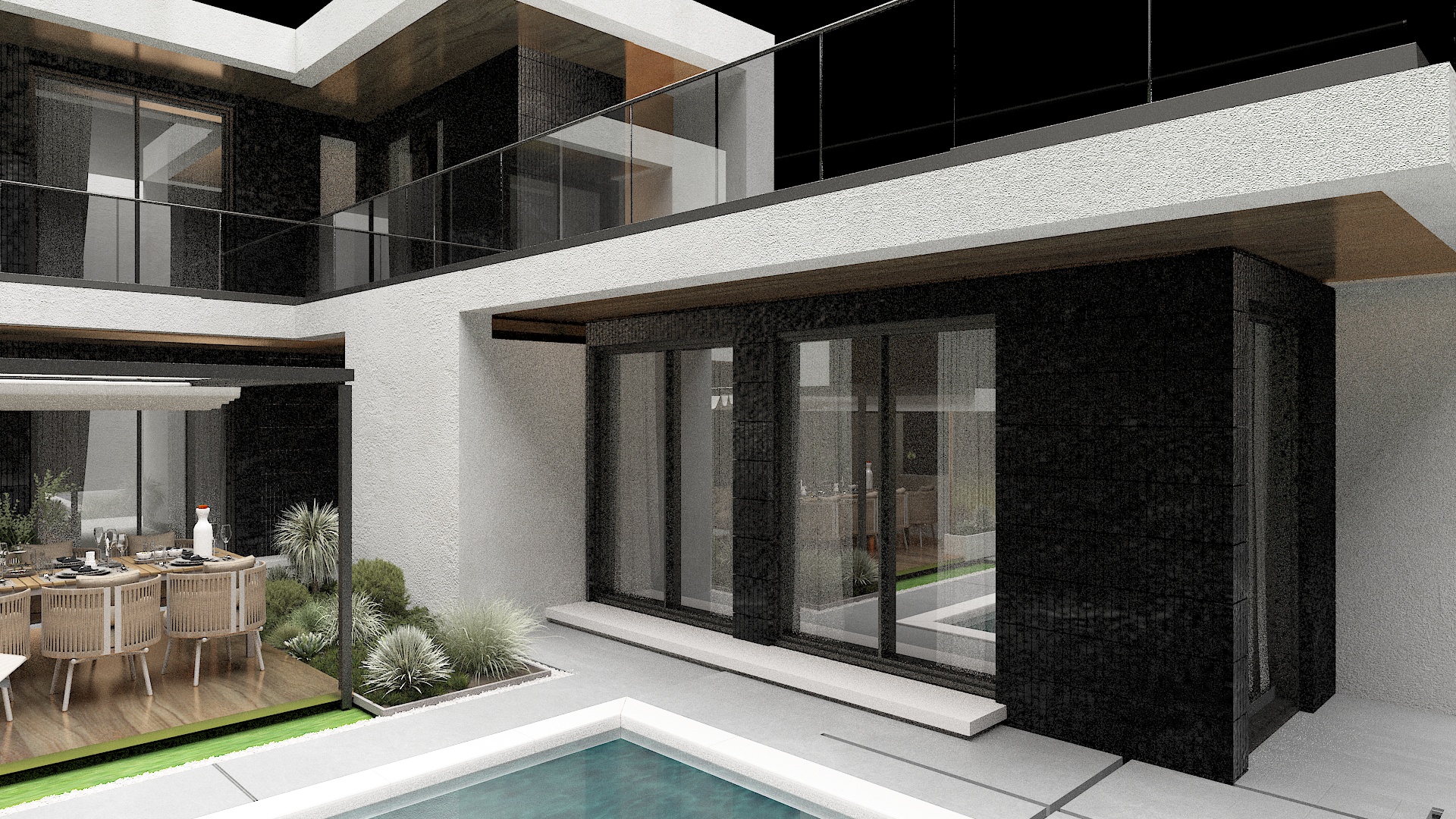 create hyper realistic rendering on this contemporary house with exposed concrete in white as well as grey black elements on the facade large glass minimalist windows and put all the wooden elements in the picture in an inconspicuous wood decor make the grass hyper realistic as well as the gray tiles in the yard the water in the pool to laze gently in the sun and a realistic picture of water in the pool itself golden hour lighting with warm light soft shadows realistic reflections make the background so that the house is located in an isolated wooded area do not change any elemet in the image do not change colours and do not add other elements