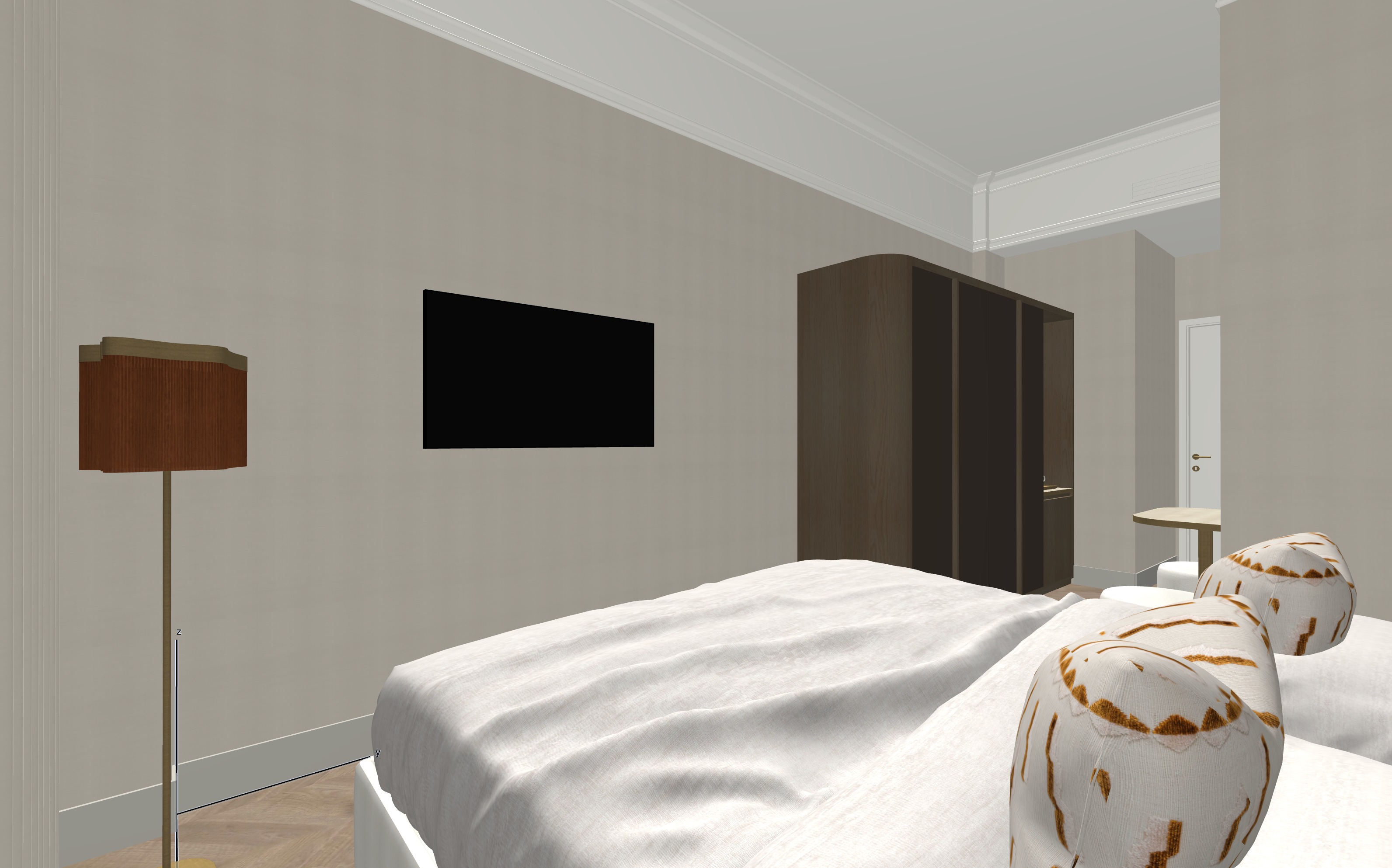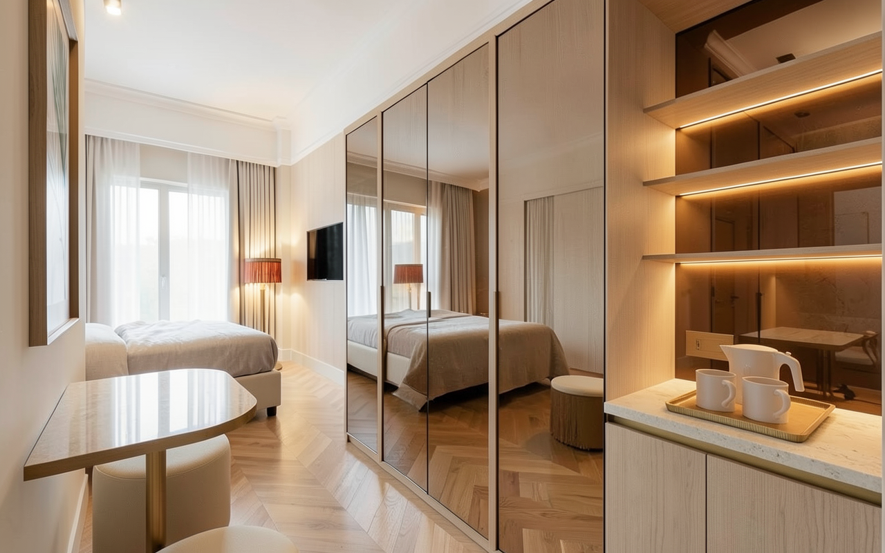 pavimento in parquet rovere chiaro con posa a spina arredi in rovere chiaro con ante armadio no maniglie tutte in specchio ambrato fondo vano a giorno frigobar in specchio ambrato no strip led mensole piano tavolino e frigobar in travertino con bordo in ottone tessuti chiari con sommier e pouf in ecopelle chiara lampada da terra a frange colore ruggine con luce accesa