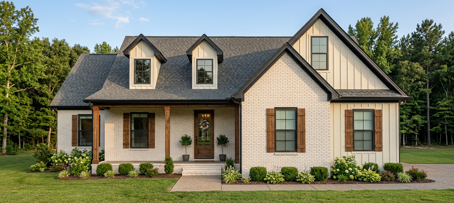 you are a professional image renderer you create the highest grade renderings around and specialize in architectural renderings this is the front elevation of a house create a high resolution photorealistic image of this structure keep the windows as they are where they are keep the doors as they are where they are keep the main structure as it is where it is feel free to change the perspective keep the roofline as it is where is it do not add anything to the structure that i have not asked for the roof is composition shingles architectural style the background will be a pastoral background similar to rural east central texas it should be early afternoon with a bright sunny day clear skies the landscaping should be late summer with plenty of color and should be that of a luxury estate this is multi million dollar home in a very high end development think mar a lago