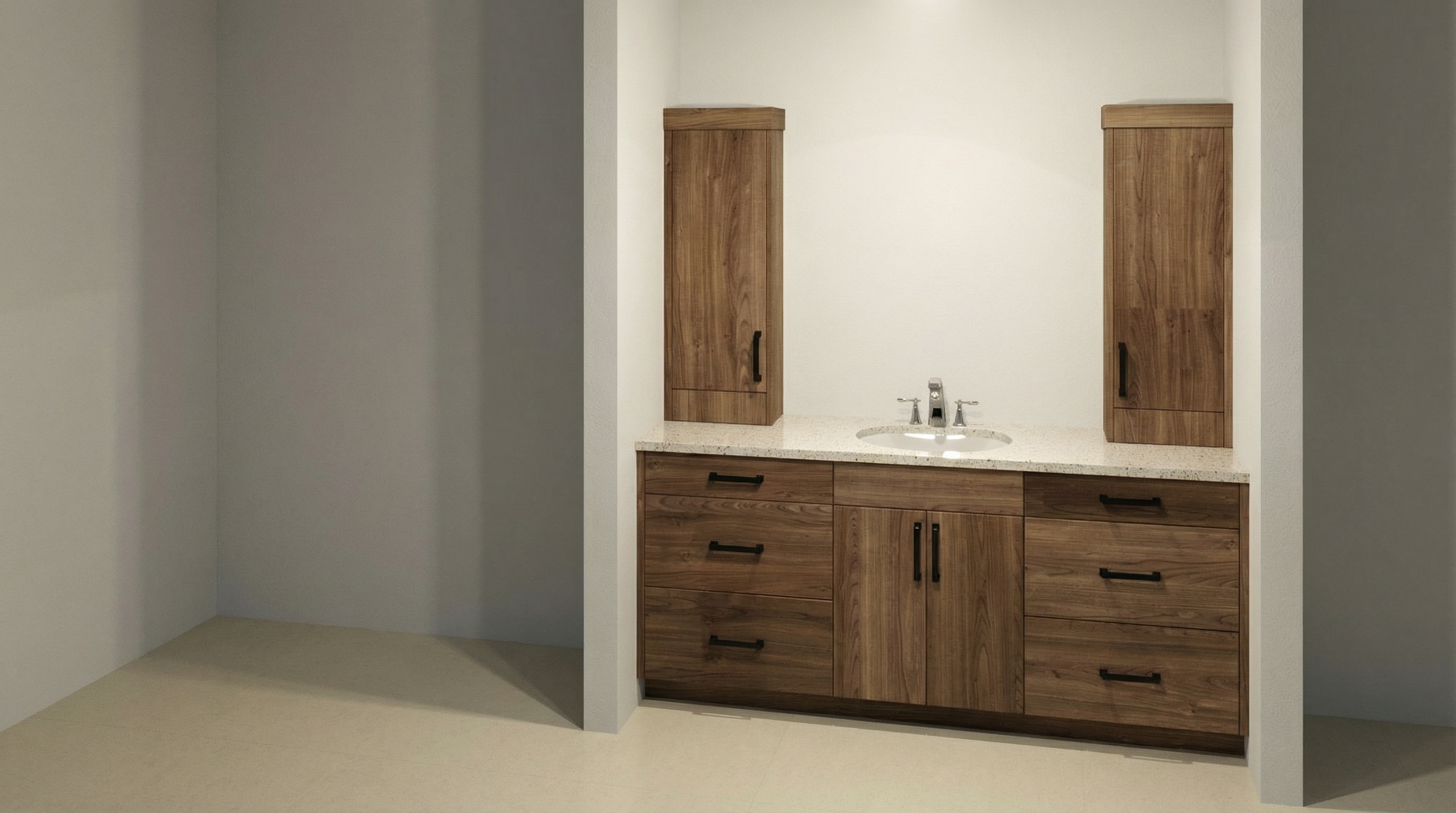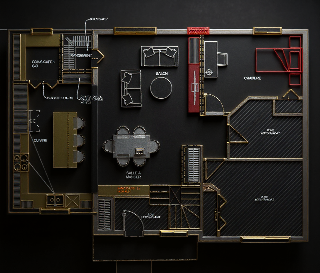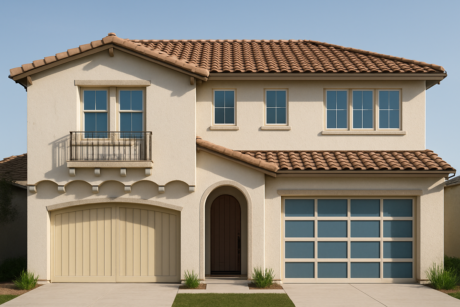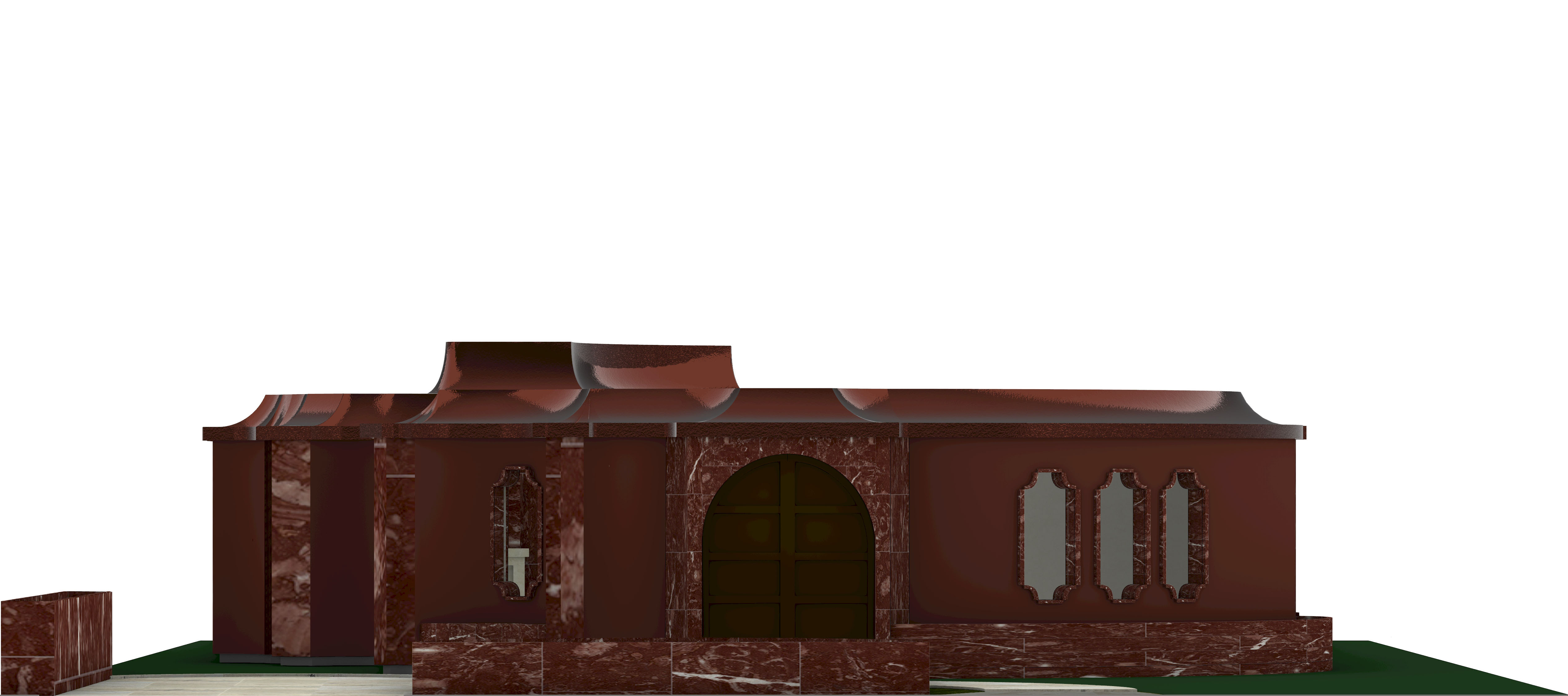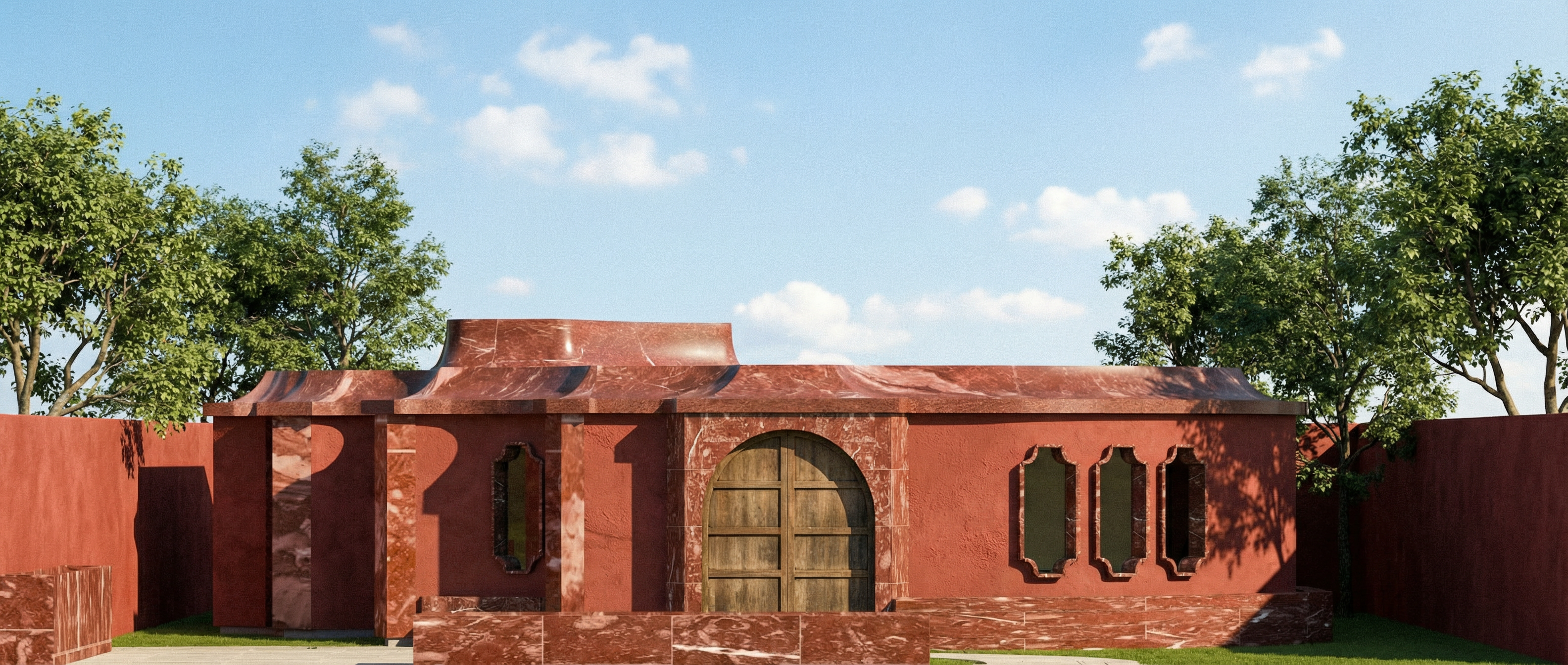 bright sunny daylight sky with a few clouds with and a cinematic mood emphasize and reduce hyper real reflections and glossiness adding subtle film grain for a photographic feel final image should feel like a conceptual architectural visualization calm atmospheric and editorial add a red plaster fence around the sides and back of property add a few trees inside of fence plants inside of marble planter