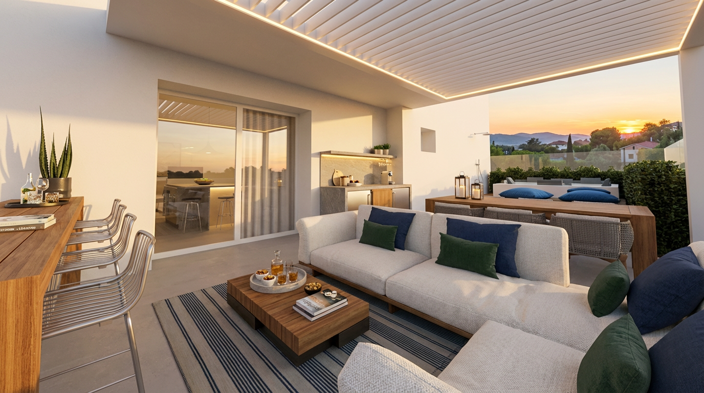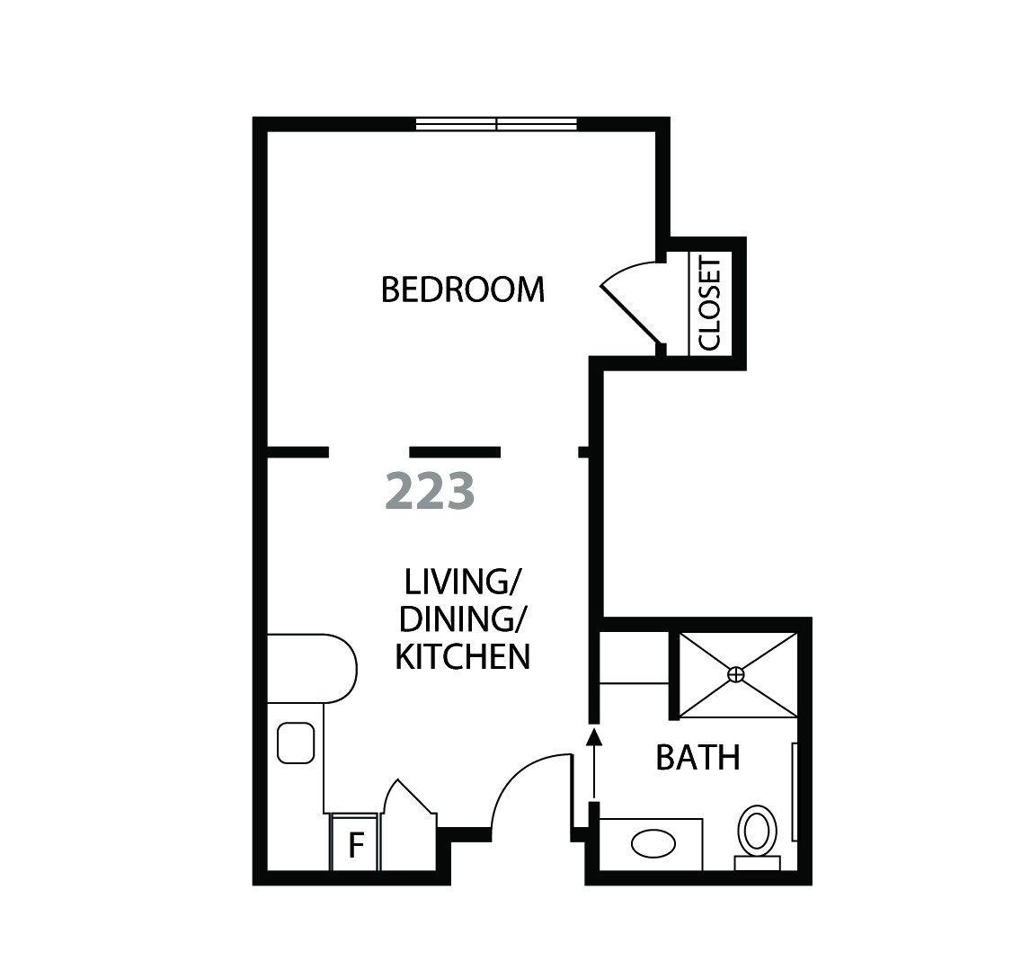 interpret this floor plan and render a photorealistic interior view from inside the living area looking toward the main seating space critical do not create a full model or dollhouse view only show what would be visible from a natural standing position inside the living room layout follow the plan exactly the entry door is behind or slightly to the side of the camera the kitchenette is along one wall the bedroom hallway opening is visible furnishing create a small well balanced living area sofa 2 seat or small 3 seat against wall one recliner or accent chair coffee table centered tv console on opposite wall small side table with lamp do not add a full dining table unless it clearly fits if included keep it very small 2 person round table style modern senior living uto style neutral palette soft blues taupes creams light wood clean minimal inviting lighting bright neutral daylight 4000 5000k no yellow tones window light should softly fill the space composition camera height 4 5 ft slight angle for depth straight verticals realistic lens result a clean believable apartment living room photo not a 3d model