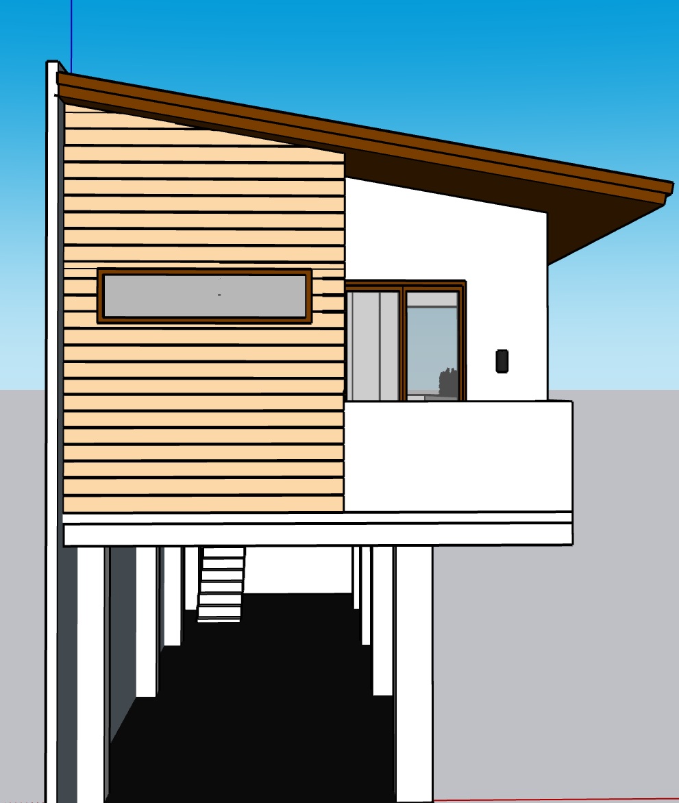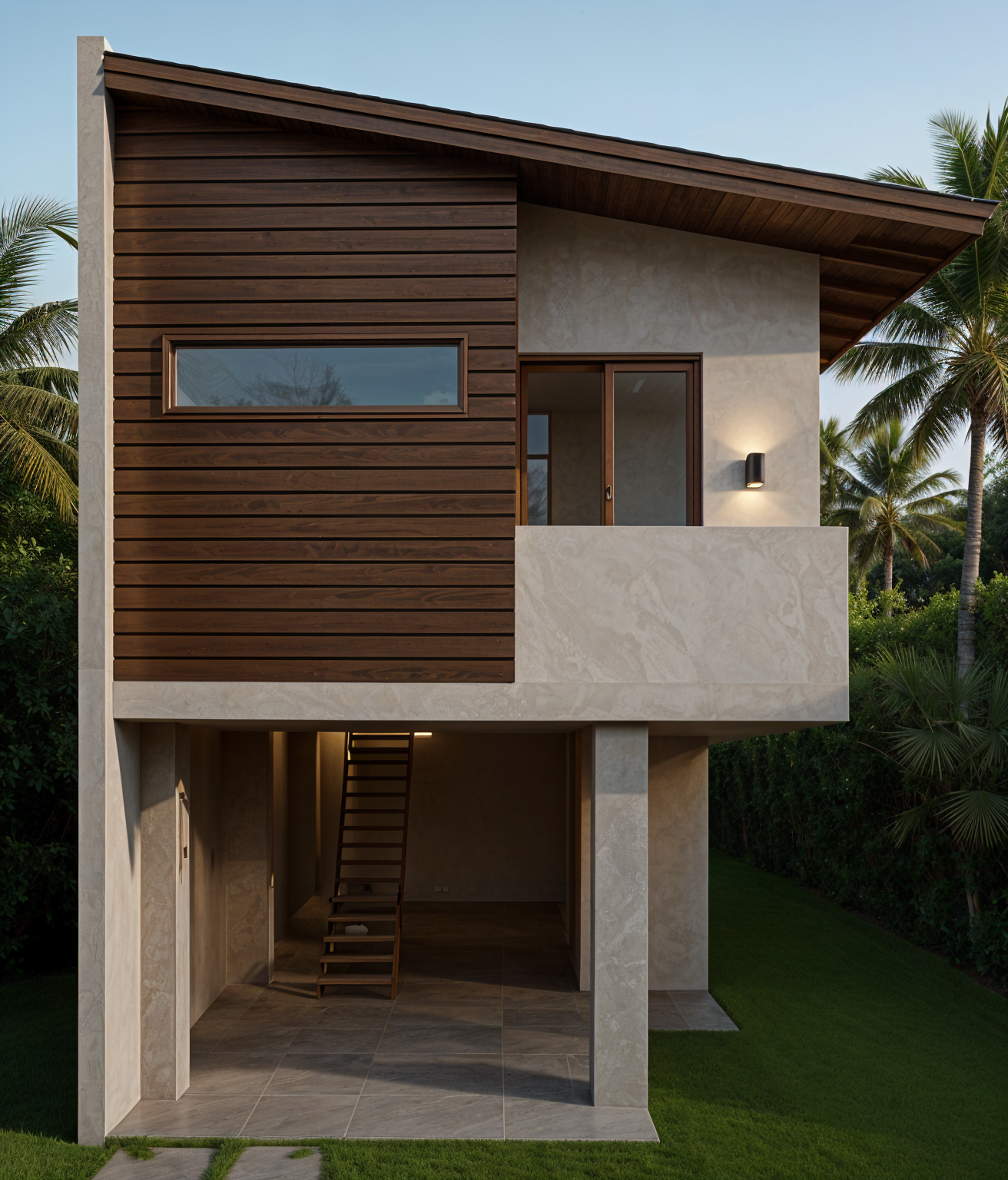 modernist exterior shot modern staircase terracotta brown horizontal cladding paint color for walls is yellowish beige lighted wall lamp wood pvc ceiling architecture