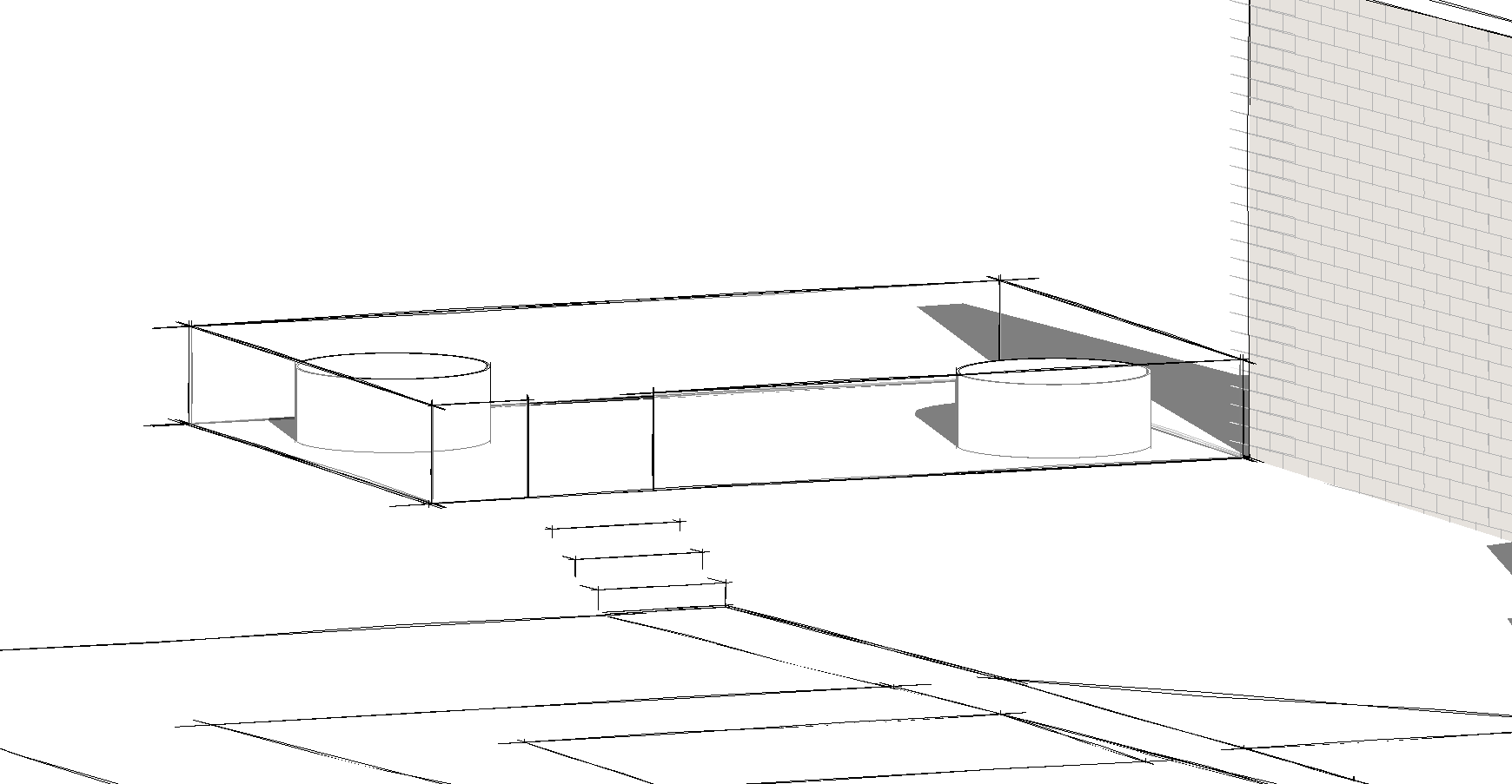 render this architectural sketch into a clean minimalistic deck design the two cylinders are hot tubs integrated seamlessly into a simple modern platform the deck should be made of smooth wood or stone with no extra elements like planters or pools place the structure against a modern brick wall as shown in the sketch surround the scene with lush green trees in the background and some natural landscaping around the deck but keep the immediate deck area uncluttered and minimal use realistic sunlight and soft shadows for a warm natural feel architecture
