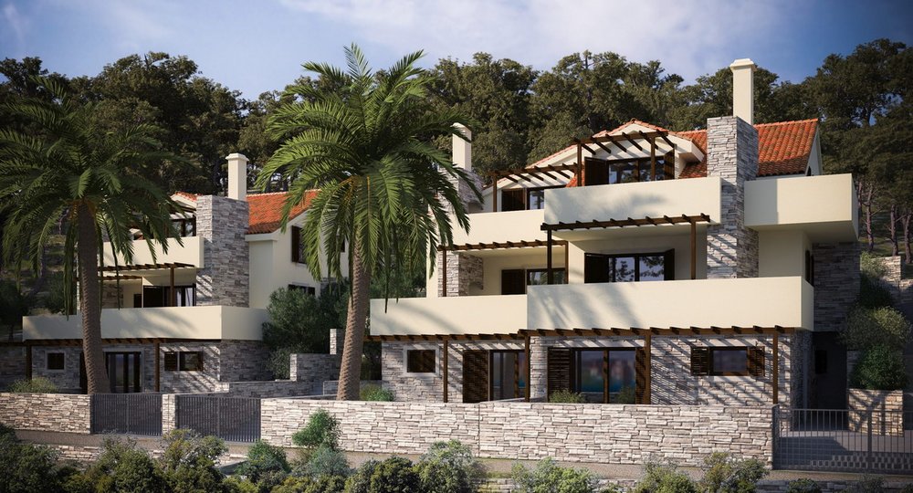 mediterranean revival exterior shot finalize exterior materials facade colour stone finish in natural stone color of windows and window shade in ral 7033 architecture