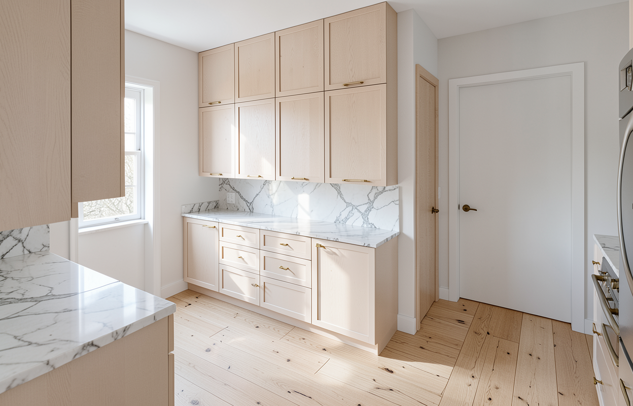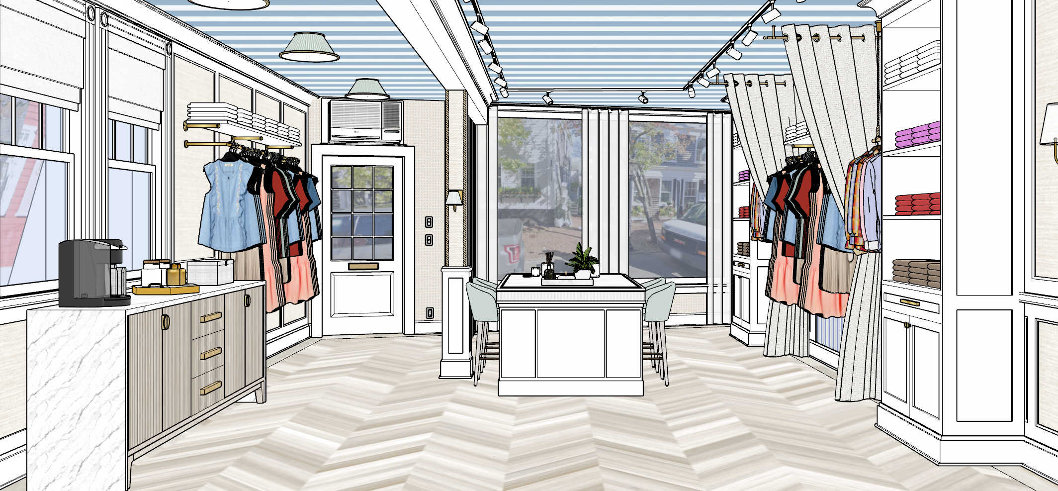 turn image to a realistic photo of the inside of the luxurious clothing store illuminate all the interior spaces noon setting add casual people shopping highly illuminated interior spaces under shelf lighting all spaces lit evenly point light to clothing white oak herringbone wood flooring