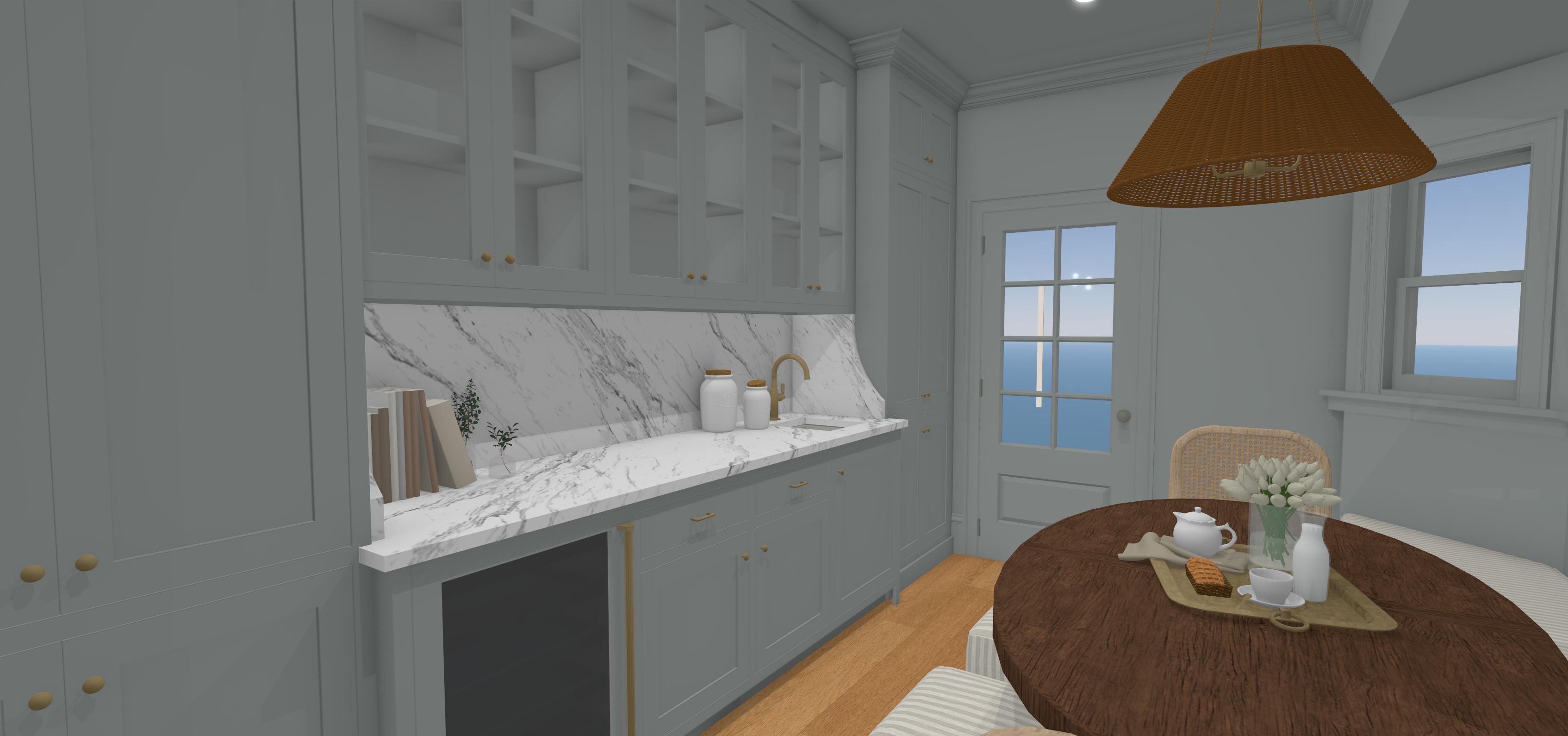 render this room with the colors shown with dramatic morning light that illuminates the soft blue cabinetry and wall color of this design