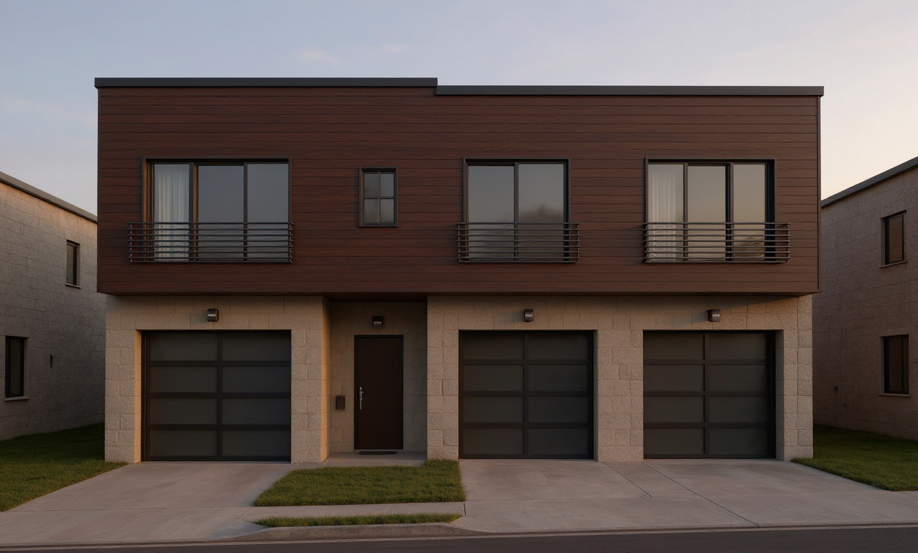 photorealistic architectural exterior render of attached elevations render should match the attached elevations perfectly and only add materials and not change the layout of garages windows door etc front elevation only 3 8 view centered on the fa ade materials horizontal dark wood composite trex like cladding on all pop out volumes horizontal board orientation pronounced grain warm dark brown light beige natural stone tile on the flat wall fields black metal framed garage doors with frosted opaque glass panels matching black framed opaque glass sliding doors above garages and black metal balcony railings simple horizontal bars roof thin dark metal coping windows large dark frames low reflection context simple grass lawn concrete driveways neutral sky soft daylight composition full building in frame camera height 8 ft slight downward angle so garage doors are visible lighting warm mid morning sun soft shadows global illumination realistic reflections render style hyper real v ray quality physically based materials high detail on wood grain and stone texture crisp edges realistic ambient occlusion and soft depth of field output ultra high resolution photorealistic