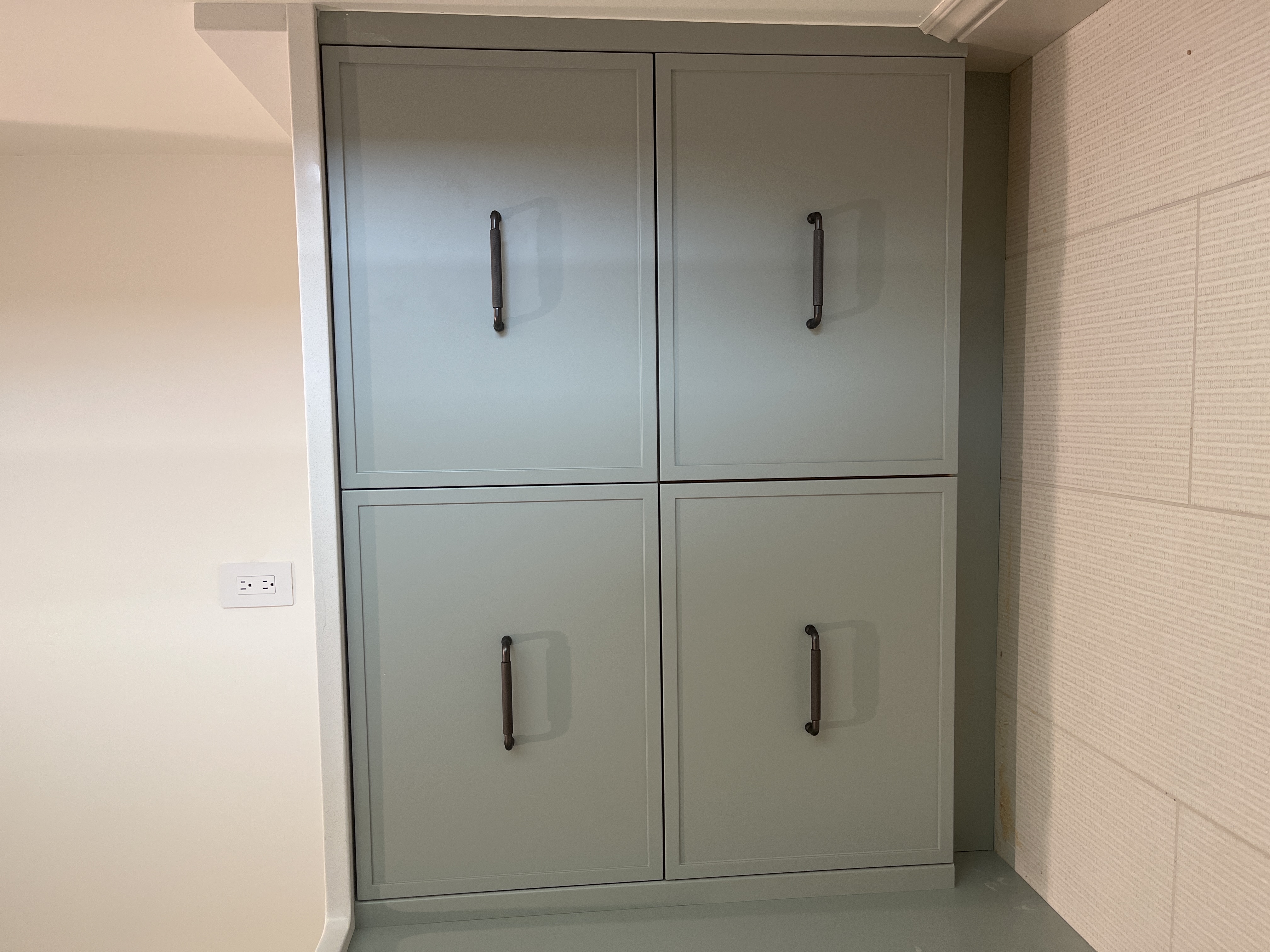 do not change the cabinets at all preserve the exact cabinet colors materials finishes door style drawer style hardware proportions reveals geometry and alignment exactly as shown do not alter the countertop flooring walls ceiling angles perspective lighting direction appliances or any architectural elements keep the camera viewpoint absolutely identical only remove clutter construction materials and unfinished areas clean the room and make it look fully finished add only minimal tasteful staging items appropriate for the space such as a small plant or a folded towel do not add any furniture or change anything about the cabinets countertop or room structure negative constraints no cabinet changes no perspective changes no angle changes no color changes no resizing no shape changes no geometry changes no filler changes no hardware changes no new cabinetry no wall changes no added shadows that distort structure stage the countertop for a laundry room