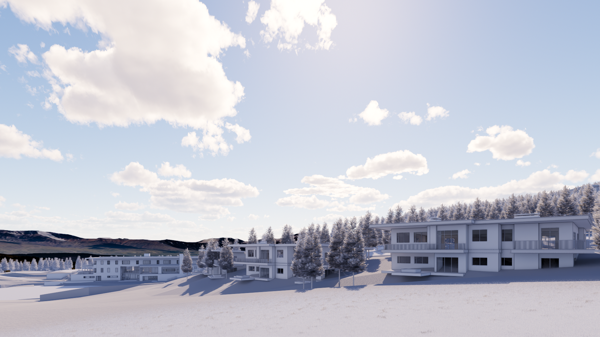 exterior shot varied light and dark woods with dry stacked stone base mountain modern materials winter scene in dense pine forest preserve grade architecture
