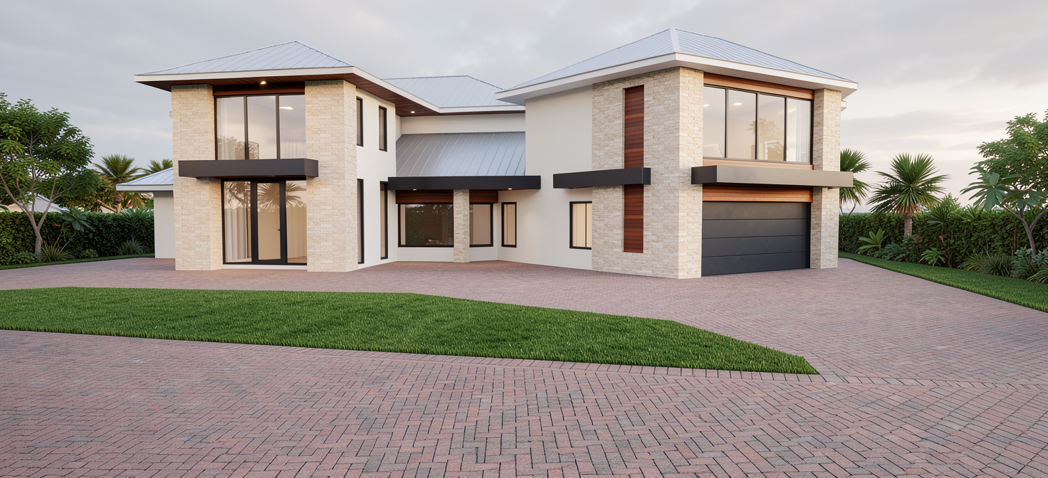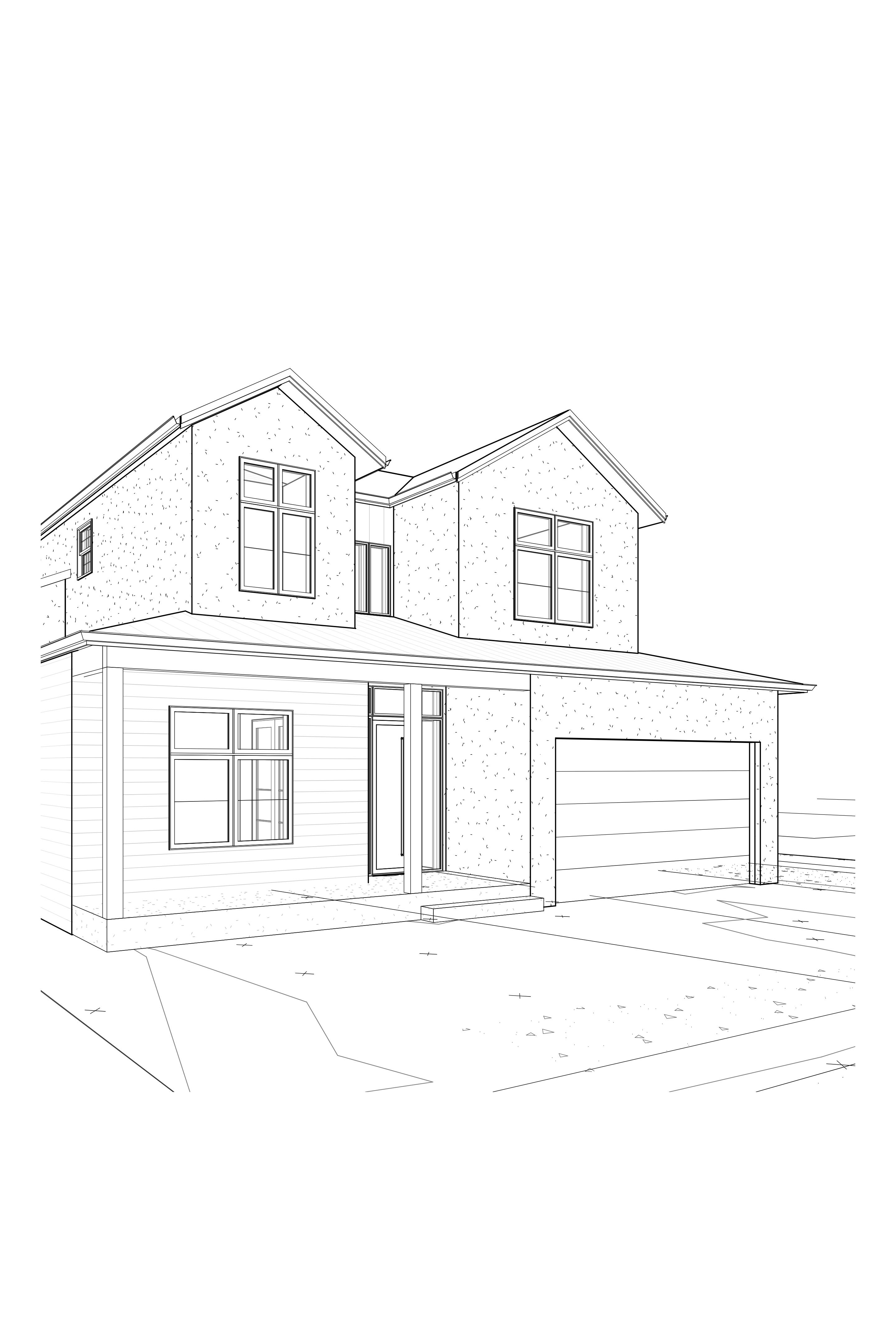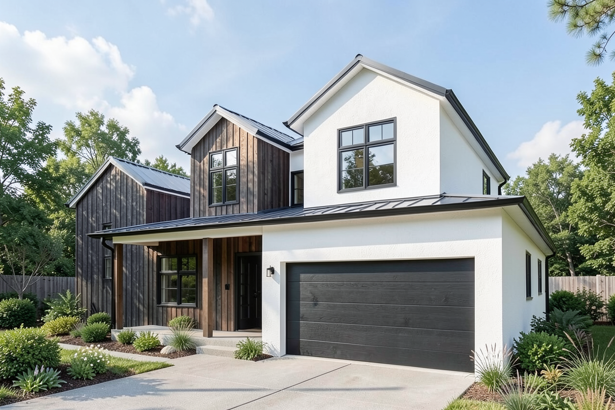 modern farm house white stucco at all walls left side is charcole wood siding vertical and center second level wall is charcold veretical siding roof all metal standgin seam color of winodw all black with black trim at facia and gutter add landscape and driveway garage door to be black wood slots please note the wood charcole siding only applies to leftside wall under the porch on fisrt level and the center wall between two wings on second level then all walls to be white stucco