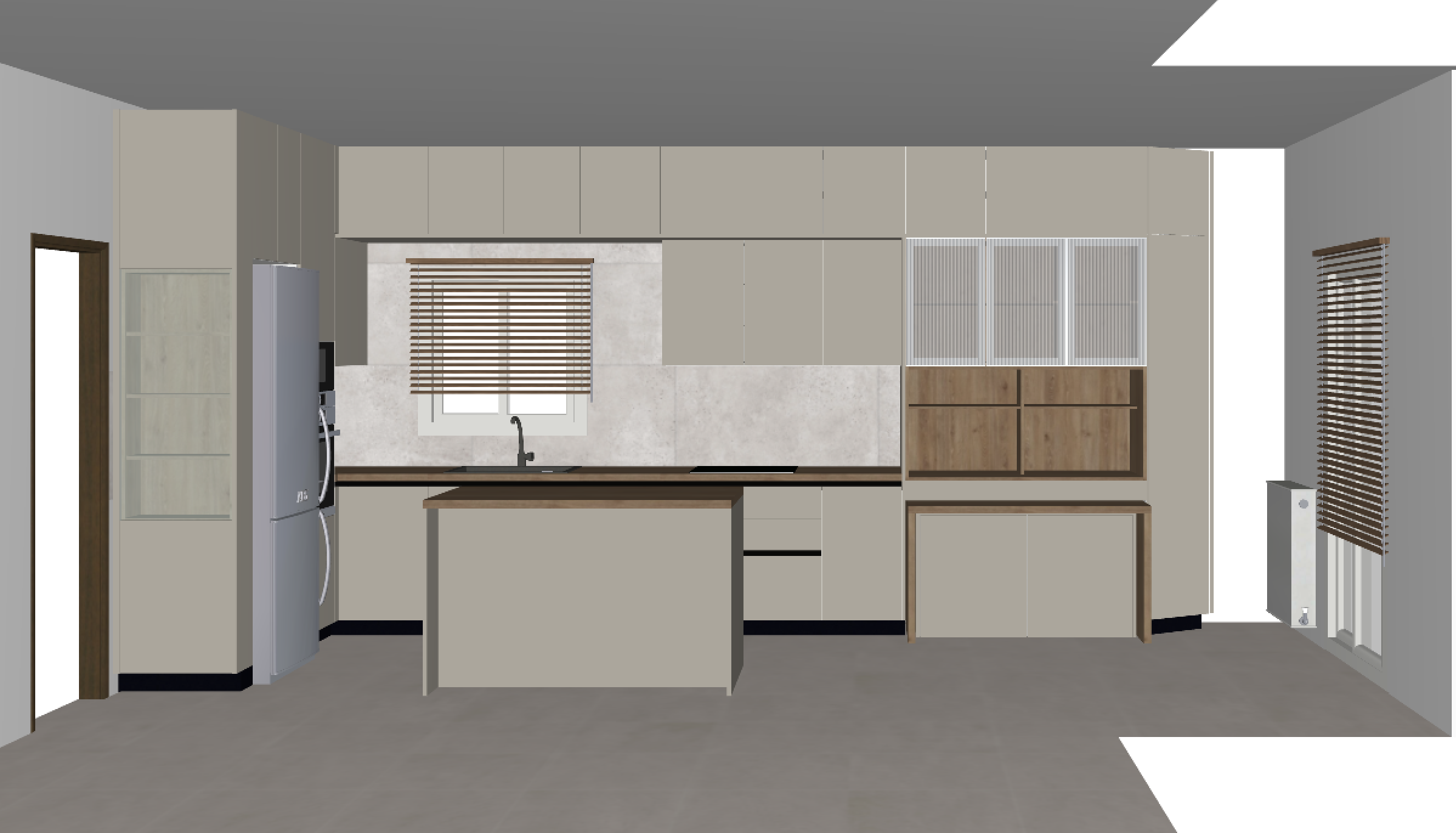 a super realistic 3d render with decoratives and stools in the island and led lights