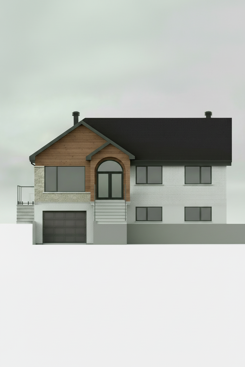 la fondation est en gris fonc en bas et le haut de a est le niveau du sol il y a des murets qui descendent vers le bas de chaque c t de la porte de garage s il vous pla t cr ez moi un rang du r alisme bas sur ces informations l avec un terrassement