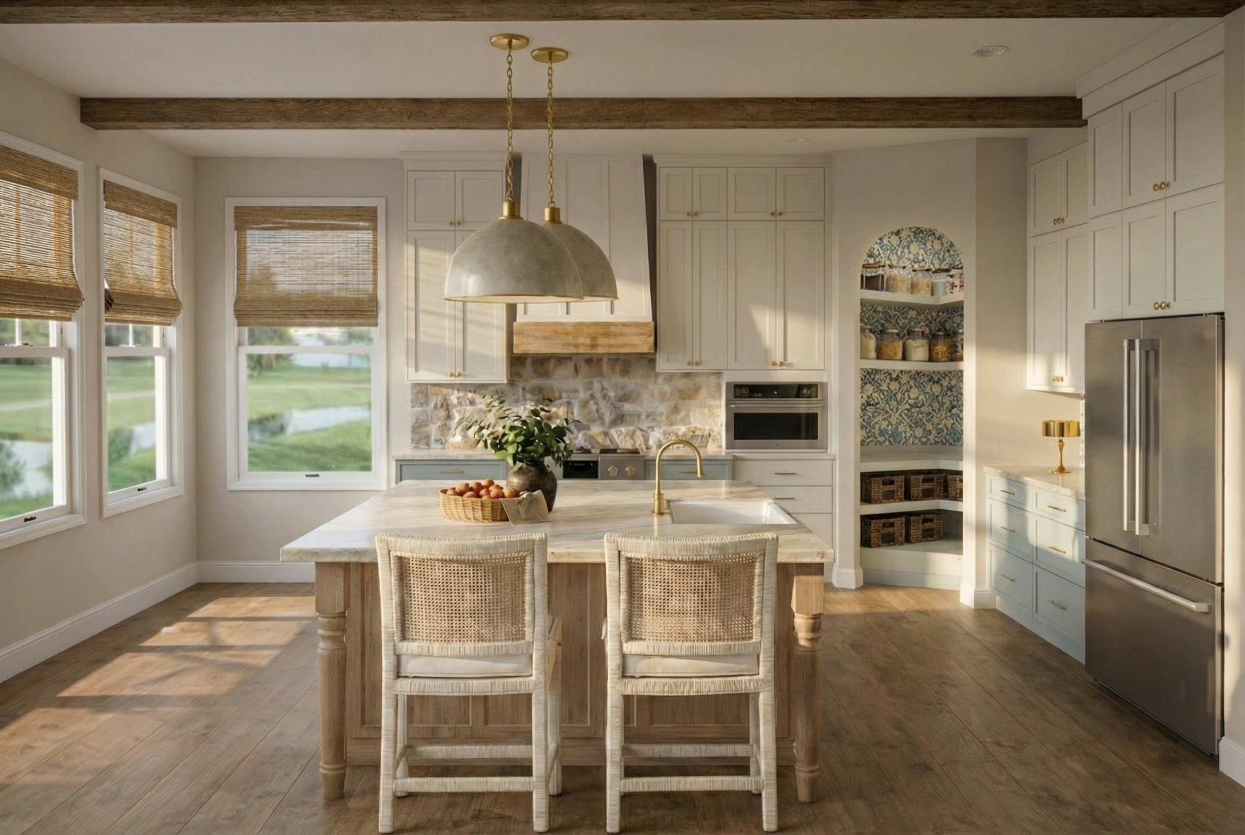 render perspective with rift white oak wood light stained finish cabinets