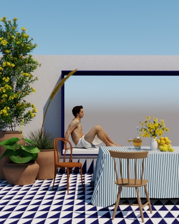 ultra photorealistic mediterranean editorial scene strictly maintain original composition and geometry exterior wall finished in white lime stucco cal blanca encalado tradicional matte mineral surface visible trowel marks subtle irregularities micro cracks soft chalky texture no smooth plastic surface matte beige porcelain floor tiles large format natural stone like mineral variation soft diffuse reflection realistic grout joints blue and white striped linen tablecloth natural linen fiber texture visible weave soft wrinkles irregular folds slightly desaturated blue tone terracotta planters with porous clay texture natural imperfections matte dusty finish wood furniture with real oak grain variation slight tonal inconsistency no glossy varnish strong mediterranean sunlight high contrast shadows warm bounce light from floor natural color temperature realistic exposure slight highlight roll off subtle filmic dynamic range cinematic editorial photography tactile materials micro surface detail physically accurate rendering no cgi plastic look no oversaturated colors no smooth synthetic surfaces