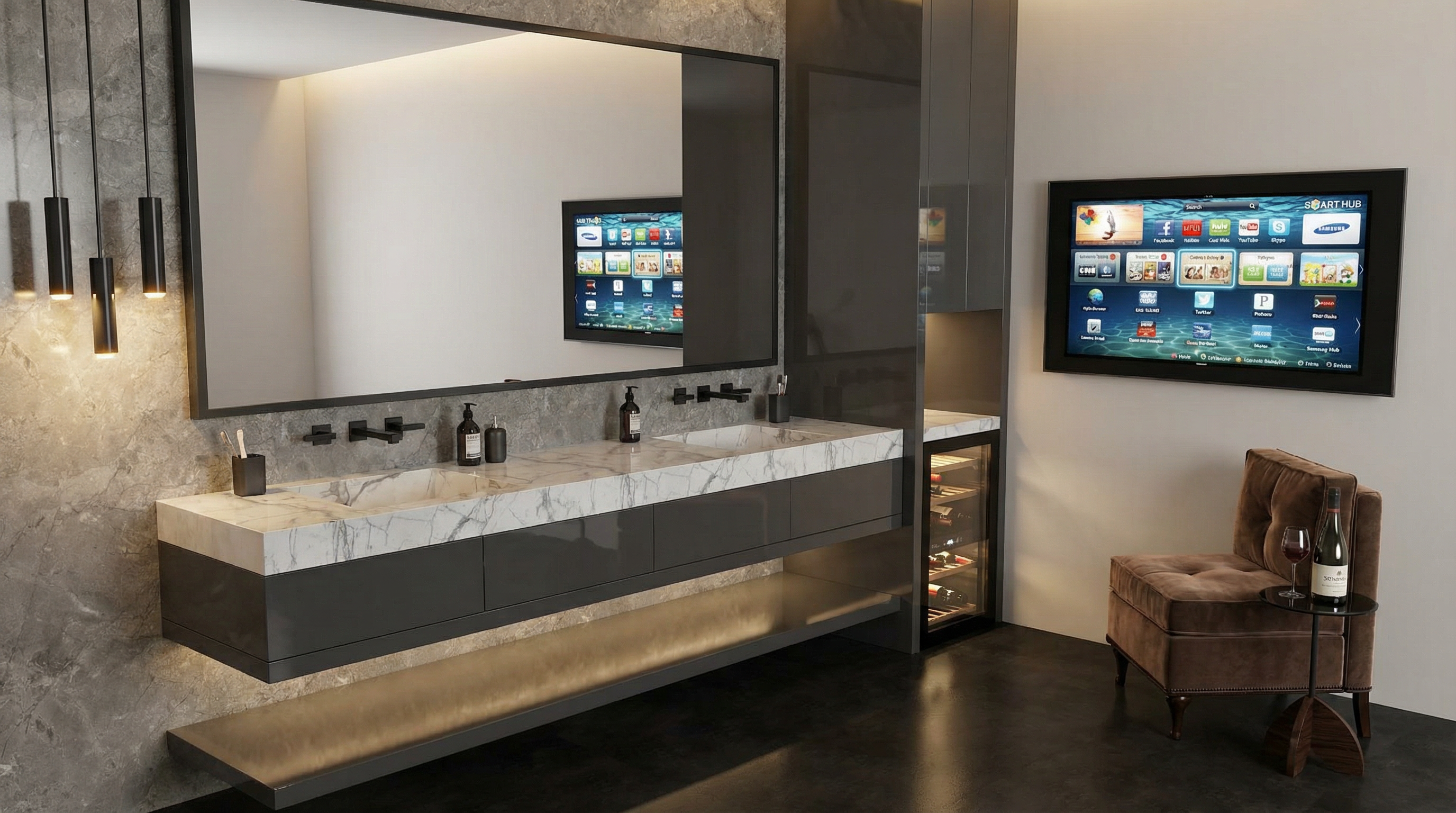 the wood is changed to a modern shiny charcoal grey paint the chair is a rust orange luxury velvet fabric high end hotel vibe