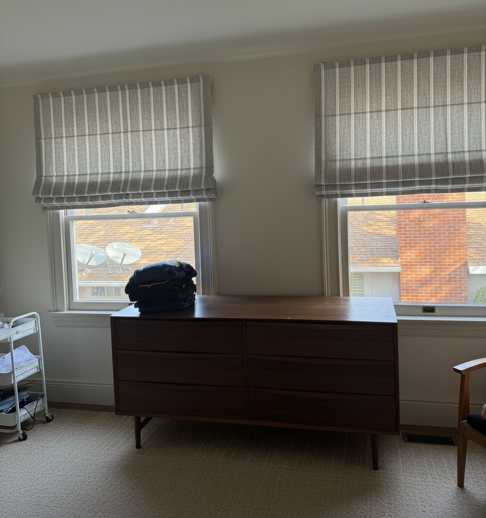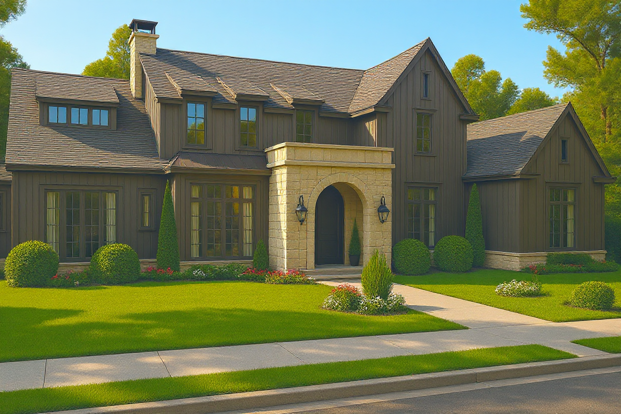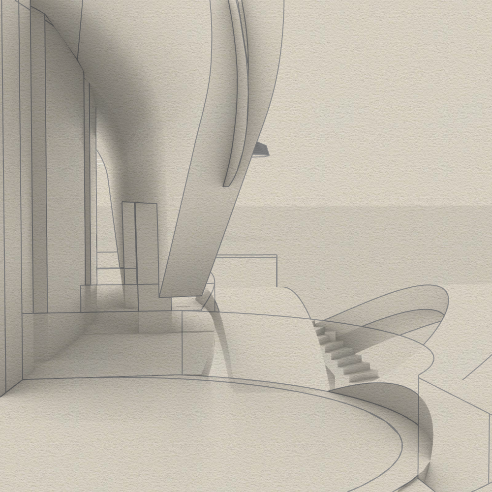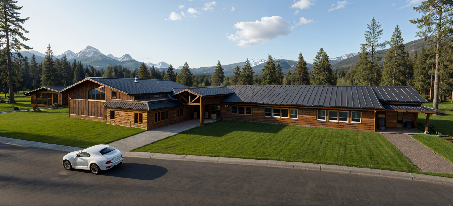 exterior view looking out to mountains and cloudy blue sky from second story balcony curved metal panel wall of the building to the left and corrugated metal roof hanging over the front glass and steel railing up front fog in the bottom distance