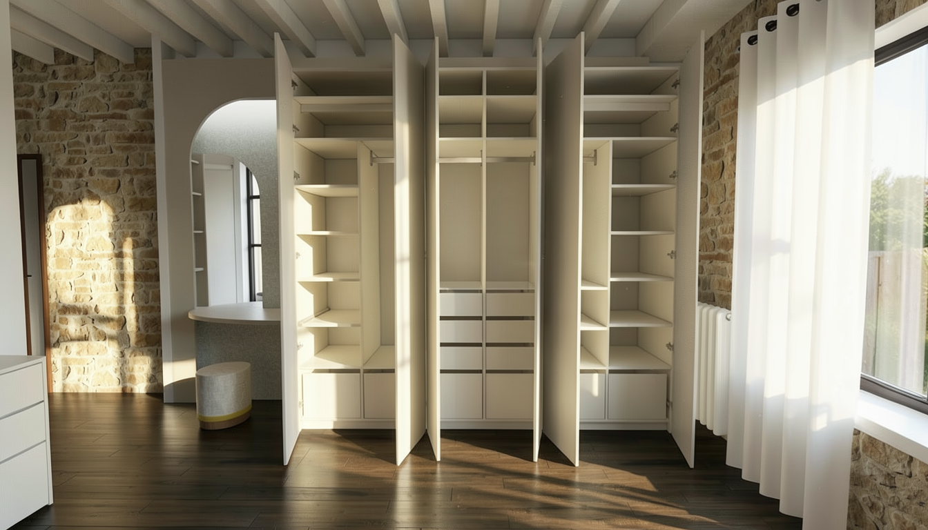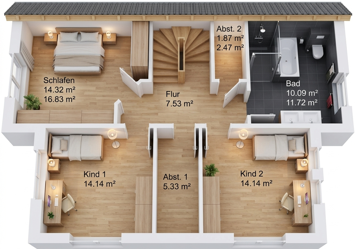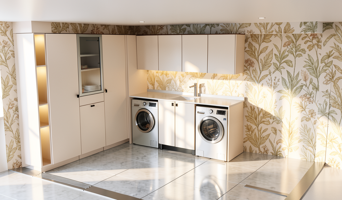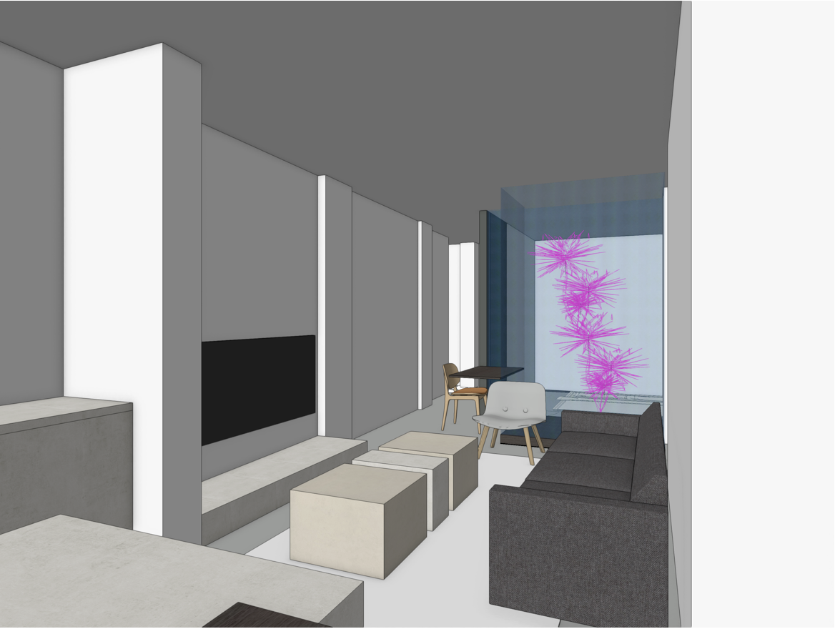 make from this plan a render in a corner in 3d render in the same colours as the plan add some minimalistic lightning above the kitchen counter add a plant on the left counter add a painting make the pink plant a dark green
