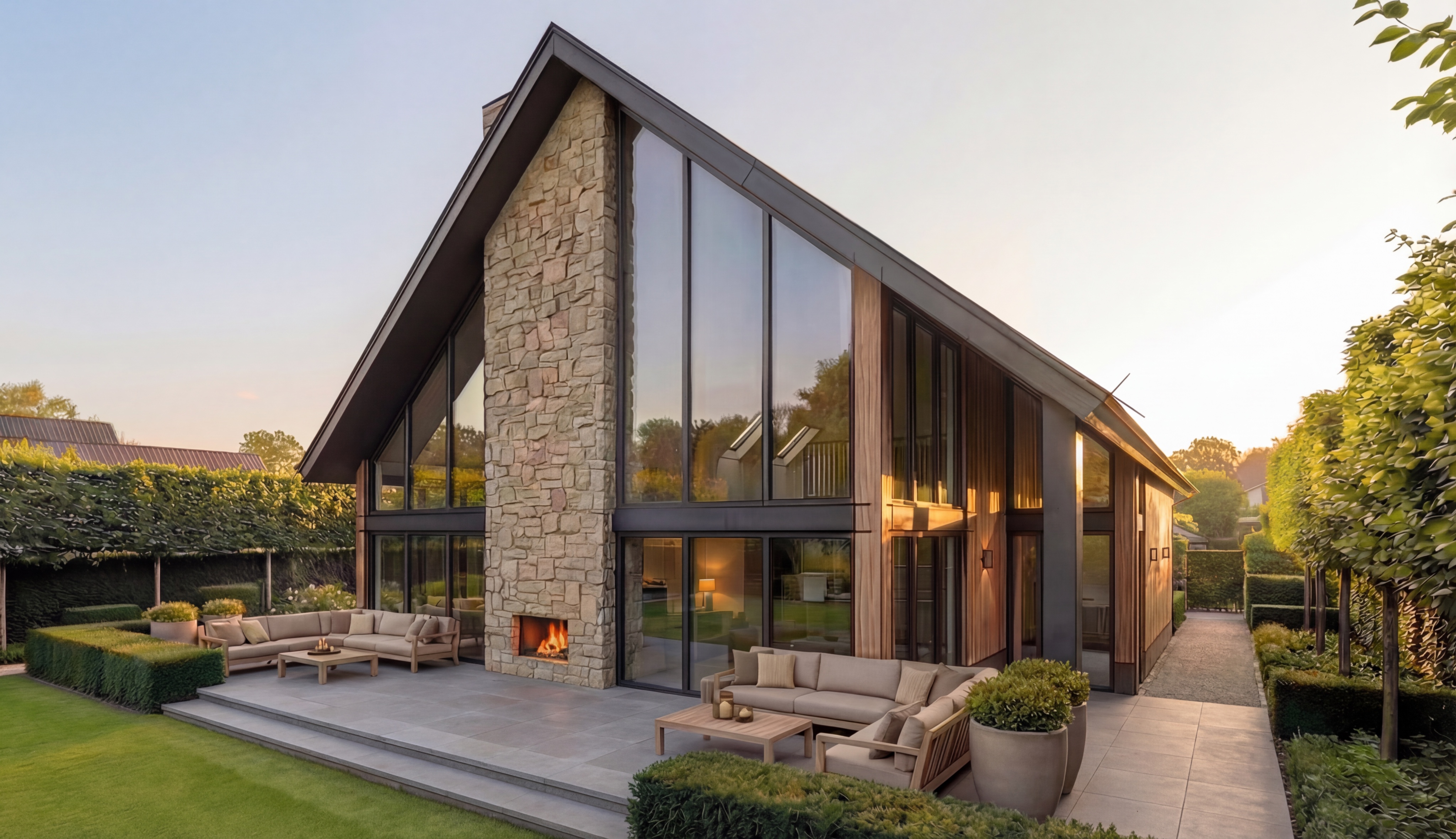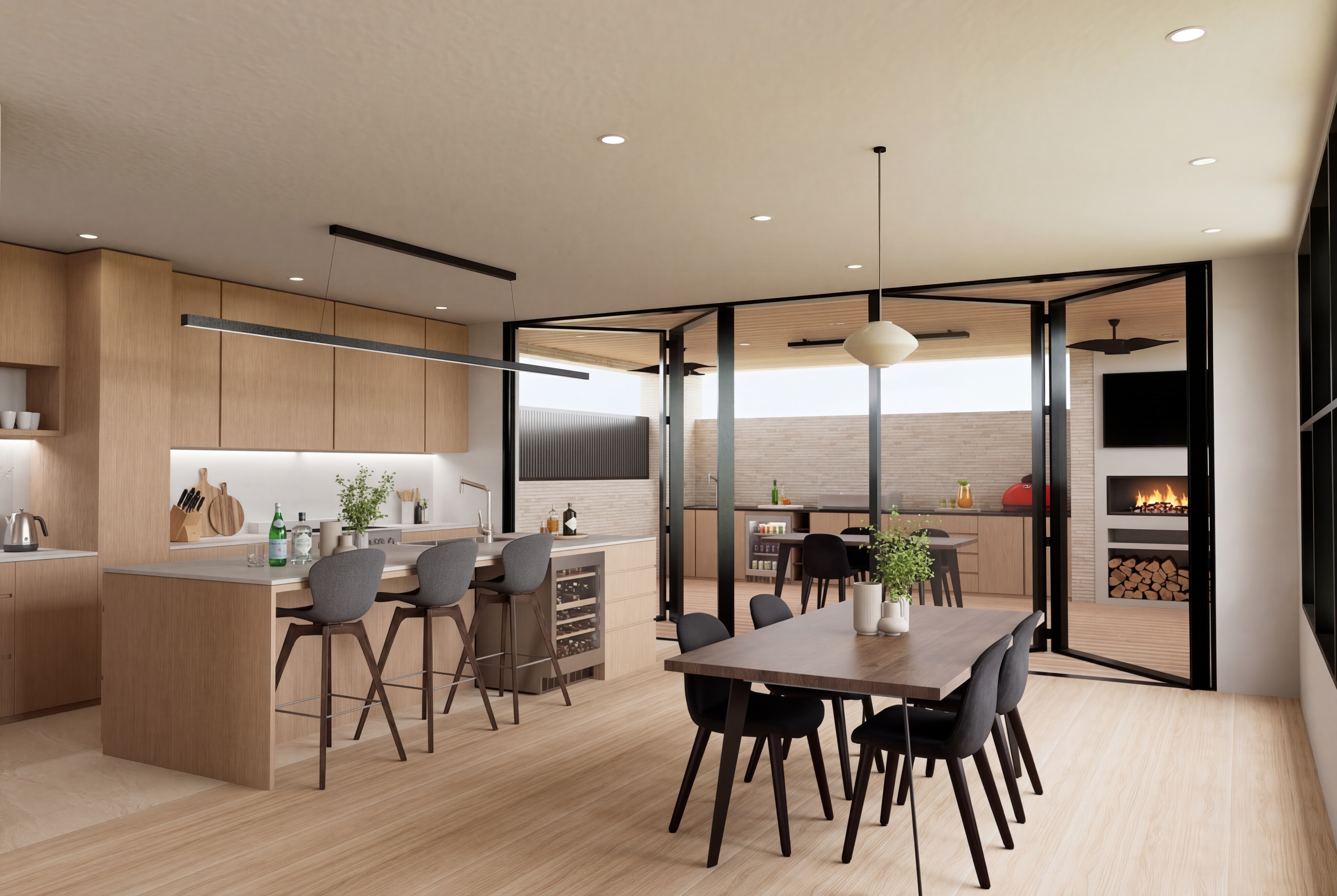 hyper realistic architectural photography high end interior design soft natural sunlight streaming through windows long soft shadows subtle ambient artificial lighting dimmable warm led accents realistic textures 8k resolution highly detailed shot on phase one xf global illumination raytraced reflections clean minimalist aesthetic lock all previous settings subject replace 3 windows on lower ground for sliding door