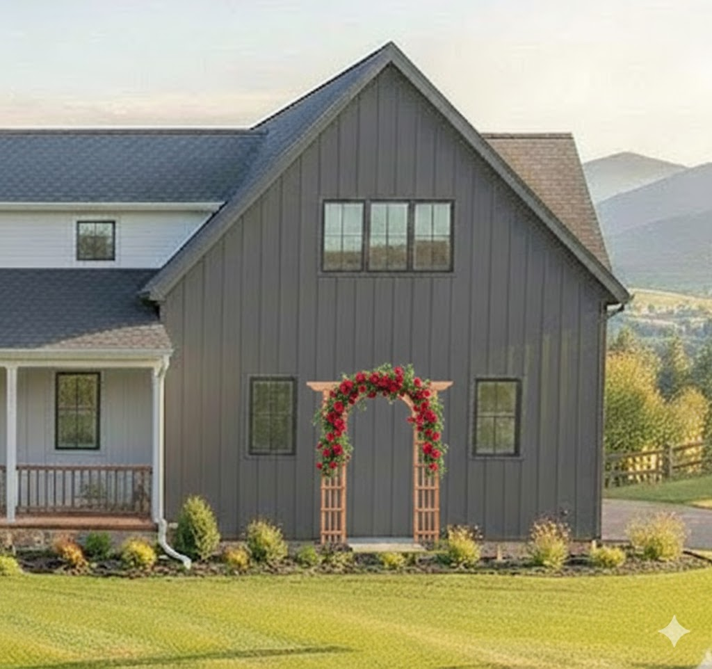 change the flowers climbing the trellis to morning glory add hostas and black eyed susans to the garden