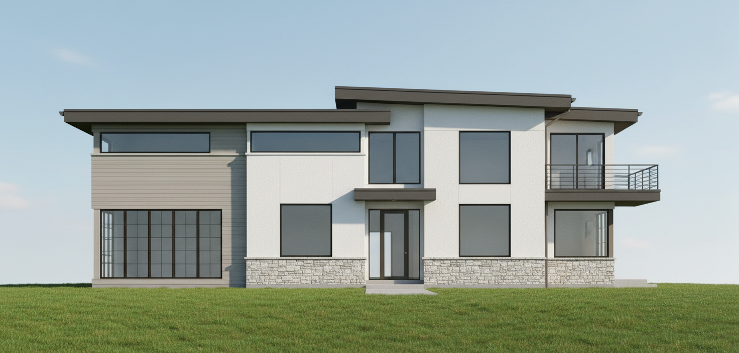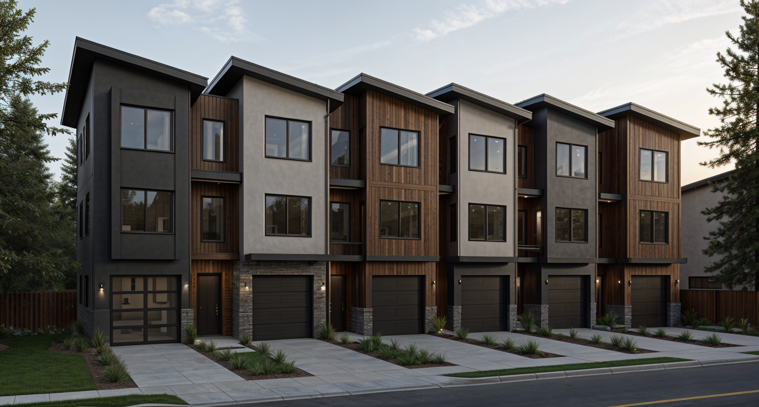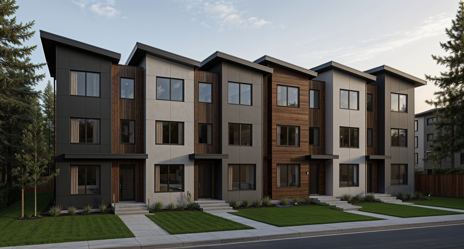 render this townhome building in a west coast modern style keeping all existing geometry and proportions exactly as shown use a refined material palette featuring dark metal panels smooth fiber cement or stucco in warm grey tones and moderate accents of natural wood such as vertical cedar cladding or soffit details to introduce warmth and texture each vertical roof segment should appear as a distinct unit by subtly varying material combinations alternating between darker metal lighter grey panels and wood tones to emphasize rhythm and individuality include black framed windows clean modern detailing and restrained trim consistent with contemporary design in front of each unit include a 3 m private amenity space defined by a modern front pathway and small landscaped area with concrete or paver surfaces low plantings and optional privacy elements like planters or short screens the overall landscape should remain minimalist and cohesive reinforcing the west coast modern character use soft natural daylight to highlight material texture depth and shadow