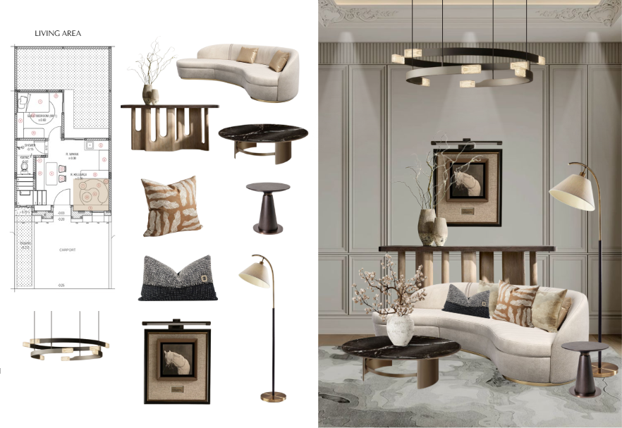 make a living room design style refer to the design board use all furnitures and furnishing just like the design board