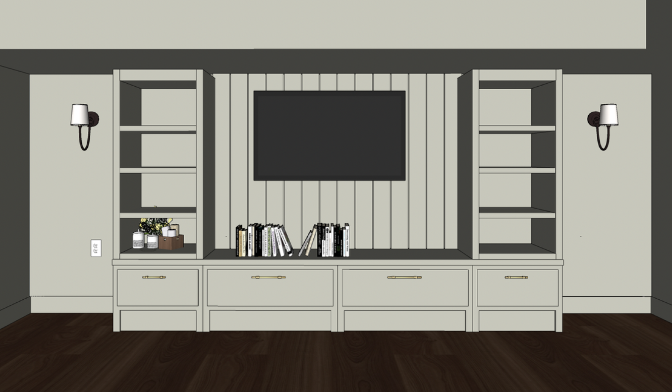 create a photorealistic render of this image the tv is a frame tv you can lower the tv down a little bit on the wall as well