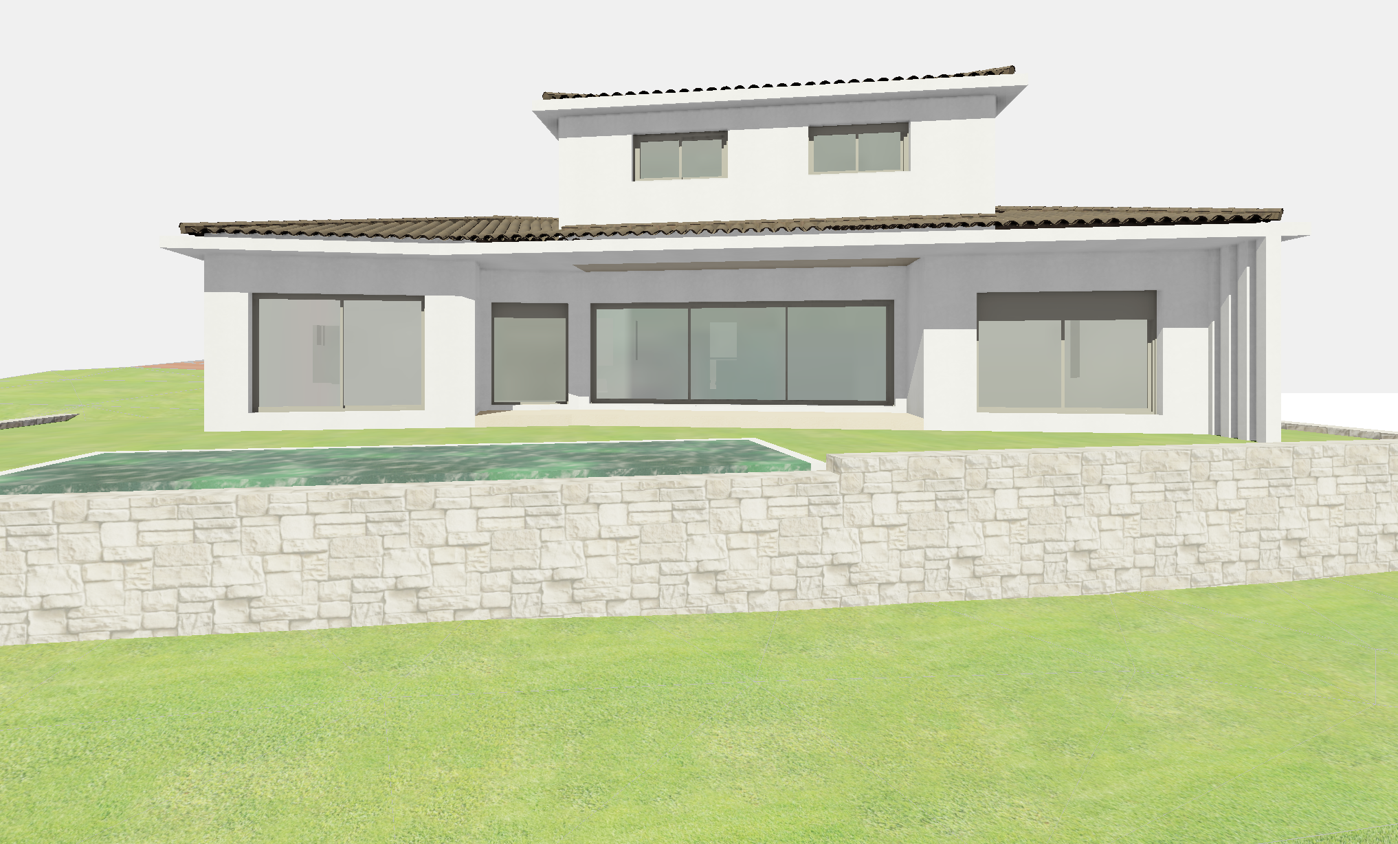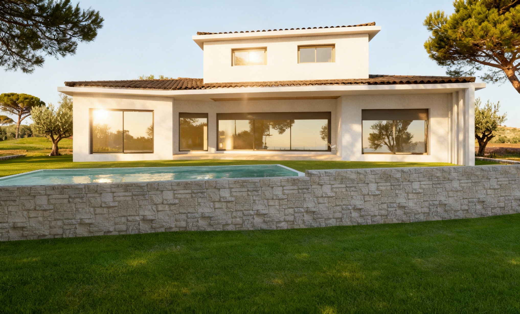 mediterranean landscape in the backgound lot of light and reflects in the windows add some mediterranean pine trees and olive trees more sun on the facade piscine en verre a debordement face a nous