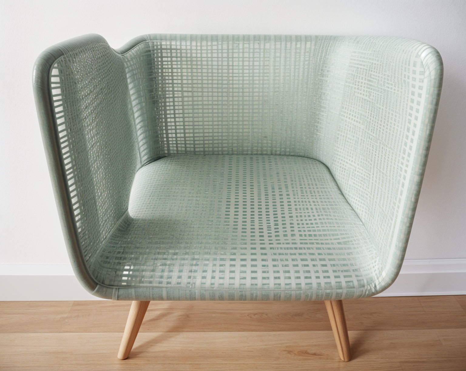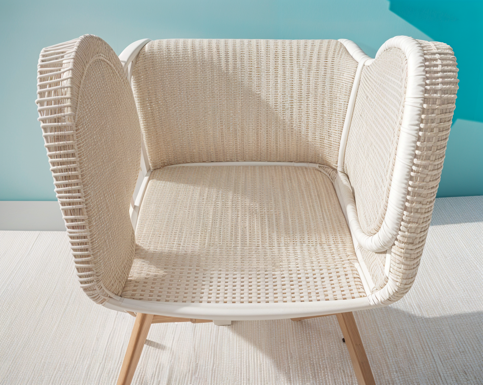 modernist perspective shot sea grass weaving inspired chair back accent upholstered seat wooden legs wire brush finish architecture