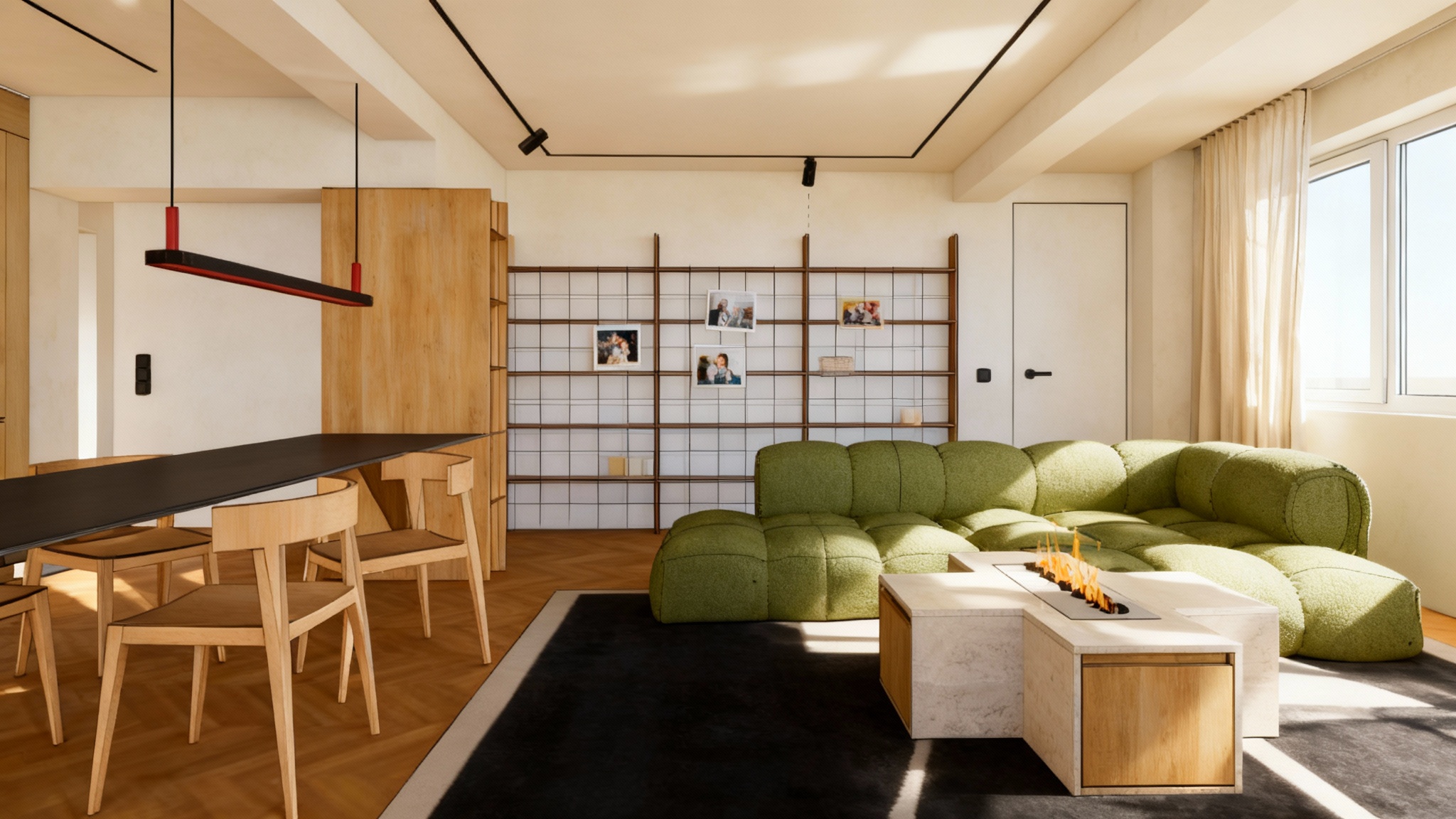 hyper realistic image minimalistic walls and floor from light white beige microcement circular mirror black mat pendant lamps natural light comes behind the camera