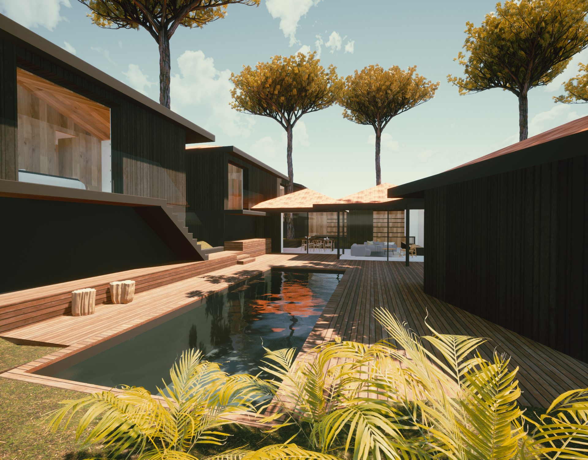 a wild lawn grasses low maintenance shrubs burnt wood facade tile roof