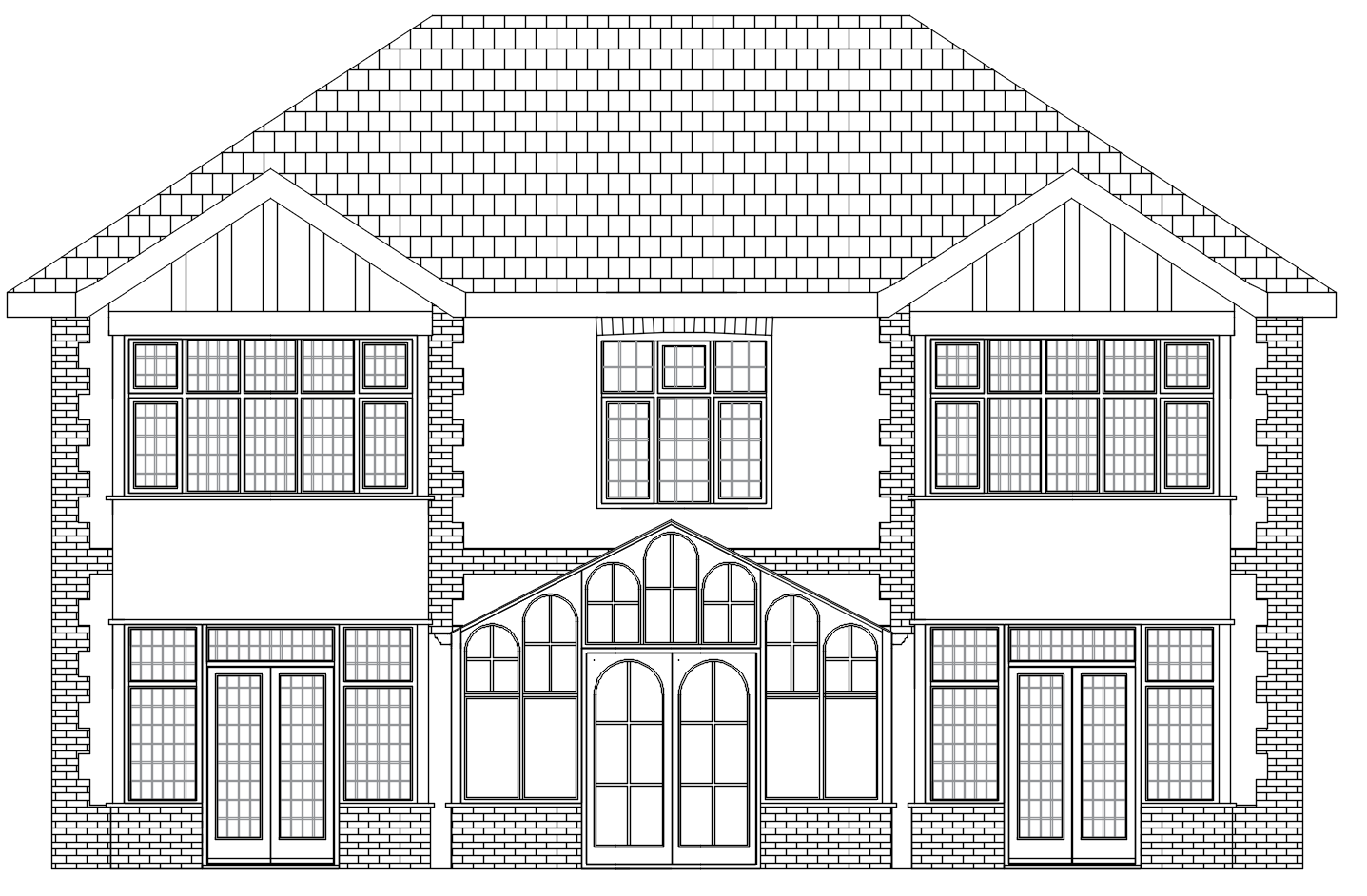 brick work as shown textured white render black timber detail in gables red clay tiles which are weathered grey porcelain patio