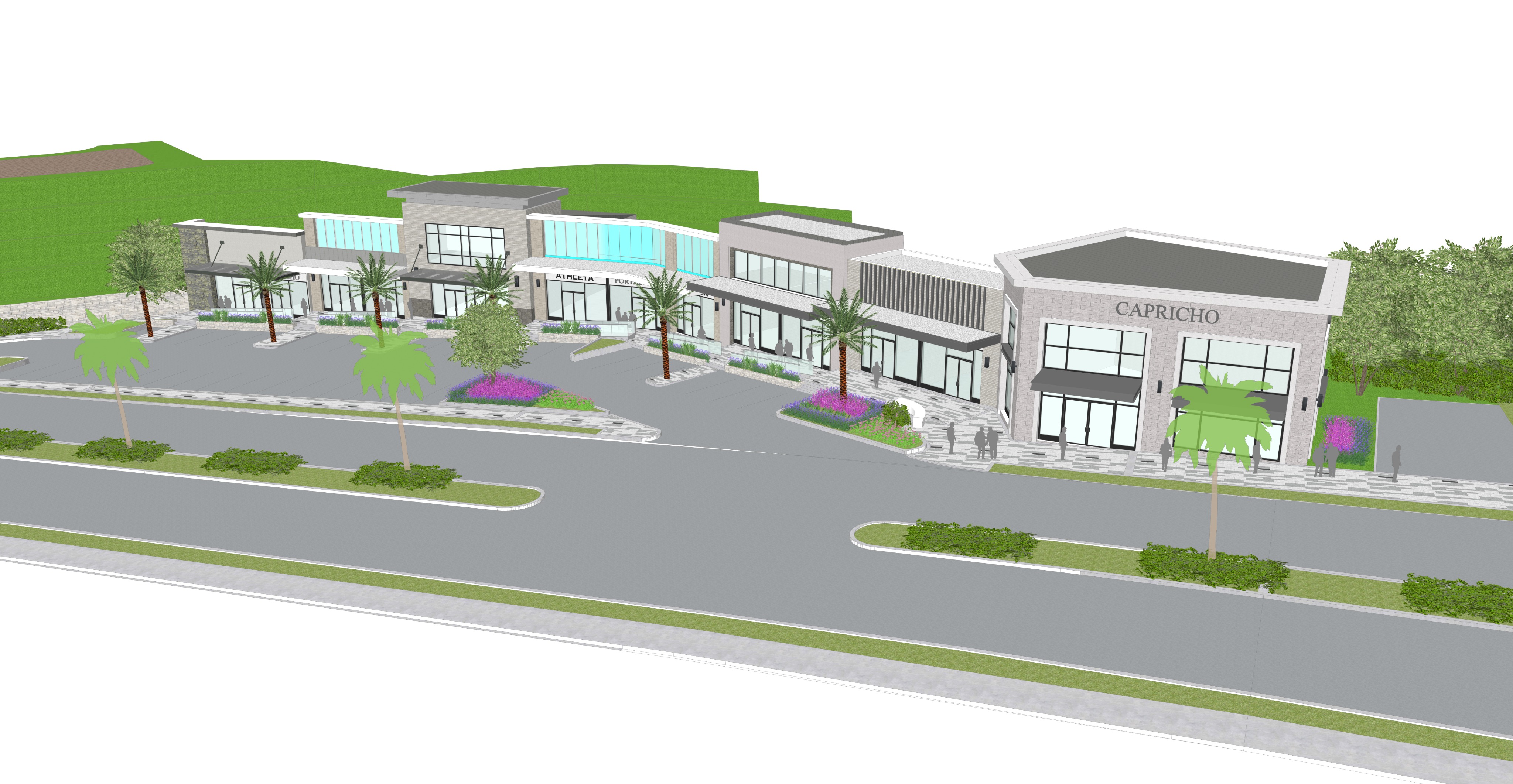 render an elegant shopping center with a modern and vibrant atmosphere buildings stucco and use large clear glass windows to reflect the surroundings the stores cothing retail space the landscape features lush green palm trees and bushes with colorful purple and pink flowers lining the pathways the parking lot contains cars that are a mix of makes models and colours with a few high end vehicles the roads are smooth asphalt with grassy green medians with some bushes and shrubs in the foreground include a golden hour sky with a few clouds and soft warm sunlight casting gentle shadows creating a welcoming and lively ambiance trees in the background maintain the building colours signage and angle as in the reference image people walking on the sidewalks and throughout the shopping centre maintain flooring styles as in reference image